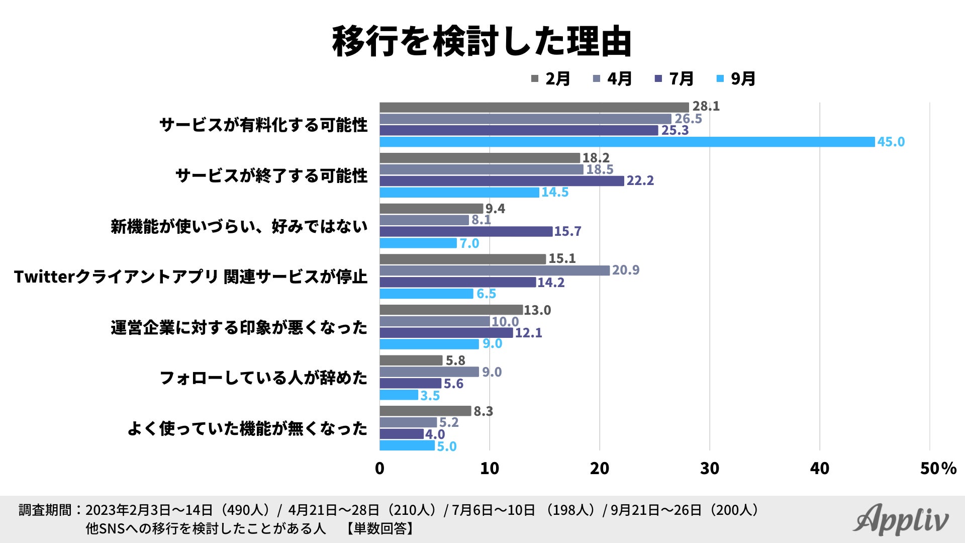 7月以降にXからの移行を検討したことがあると回答した200人に理由を尋ねたところ、最も多いのは「Xが有料化する可能性(45.0%)」で前回の2倍近い結果となりました。有料化は、過去3回全ての調査で、移行検討理由の1位に選ばれています。