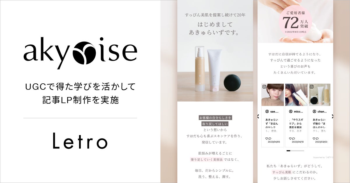 そのような中、記事LPの訴求が一つの勝ちパターンに固定化していた状態から脱却し、獲得効率の抜本的な改善を目指すために、UGCから見えた「お客様の体験価値」をもとに新たな訴求の記事LP制作を検討。そこで、これまでUGC運用を通じて、あきゅらいずの顧客を深く理解し、累計約15万件にも及ぶ新規獲得LPの運用改善を見てきたLetroと共に新たな記事LPを制作するに至りました。