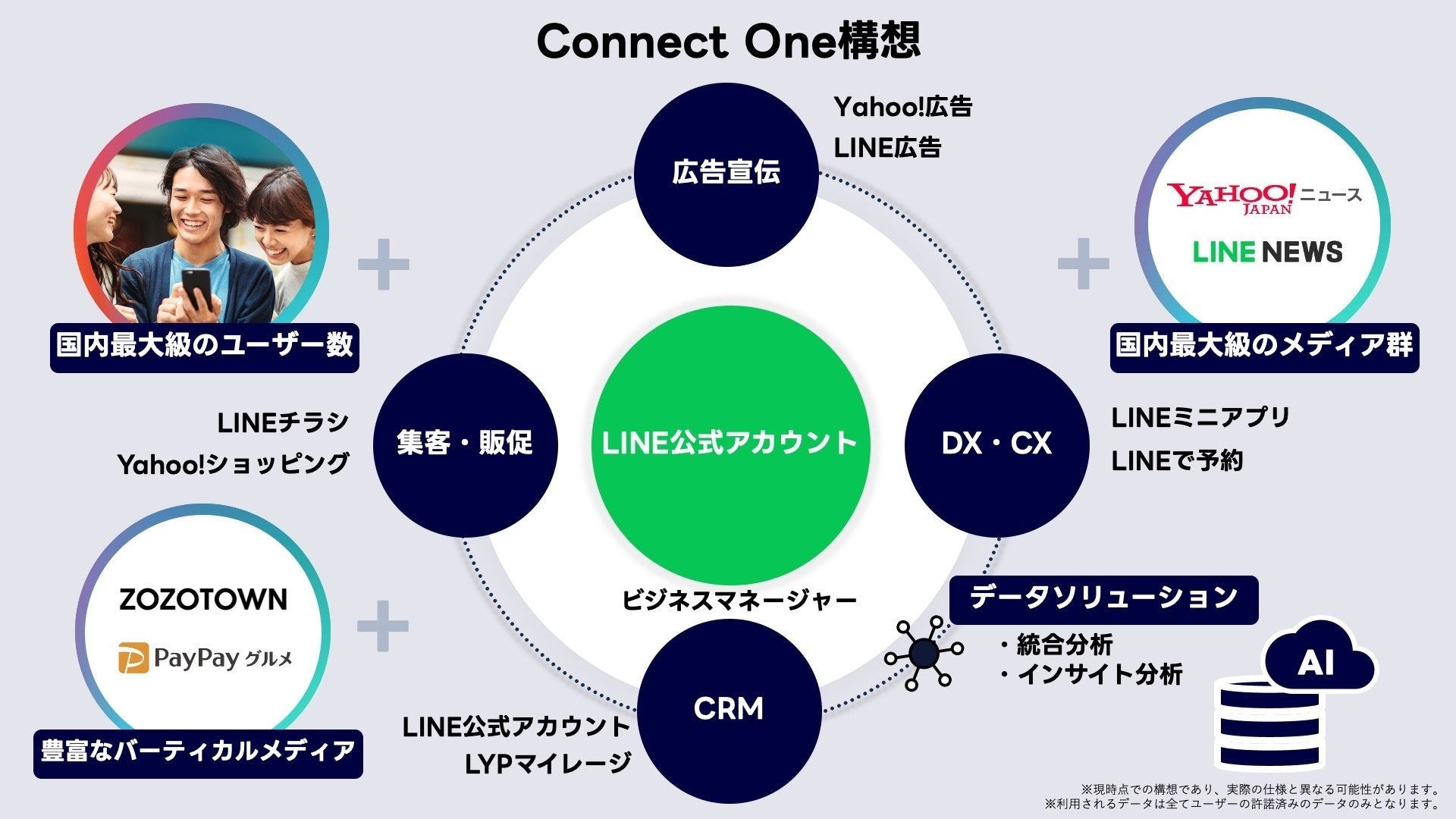 LINEヤフーは、「LINE公式アカウント」とLINEヤフーが保有する法人向けサービスを連携し、あらゆる顧客接点を一気通貫させLTVを最大化させるプラットフォーム「Connect One」構想※1を発表しました。