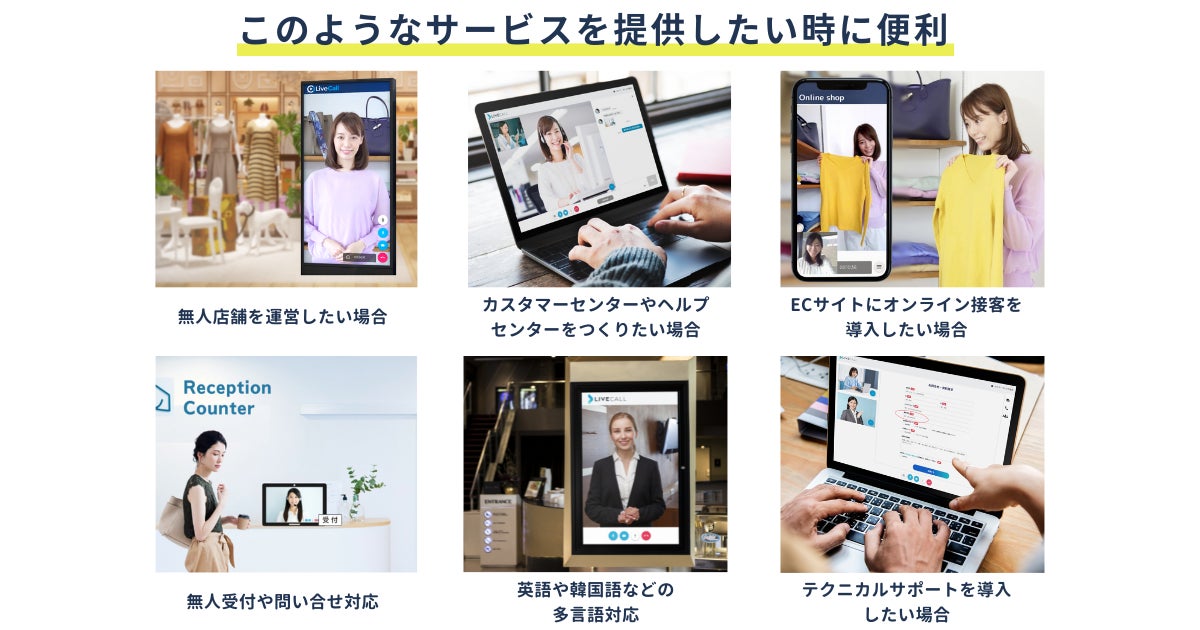LiveCallは2015年ローンチ以降、あらゆる対面サービスをリモート化することをミッションに掲げ、リテール業界のオンライン接客のほか、金融機関などにおけるeKYC用途、遠隔医療、オンライン中古査定、宿泊施設のリモートチェックインなど、様々な業界のサービスをリモート化するお手伝いを通して、時間と空間にとらわれないニューノーマル時代の新しい接客のカタチを後押ししています。