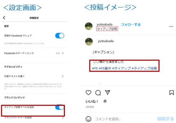 Instagramでは、Instagramの規約上、タイアップタグの設定が必要です。また、キャプションでの記載も行いましょう。「#AD」といった記載でもOKです。