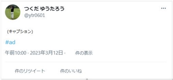 X(旧Twitter)では、本文中に「#AD」「#paidpartnership」「#sponsored」といった、関係性の明示表現が義務付けられます。わかりやすい記載が必要で、ハッシュタグを多数入れてまぎれこませることはNGです。ハッシュタグの先頭や、すべての文末などにわかりやすく記載しましょう。ツリーの場合は、最初の投稿に記載します。