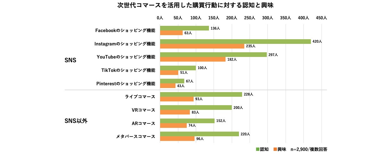 次世代コマースの中では、InstagramとYouTubeの興味と認知が突出した結果となりました。SNSが比較検討フェーズで存在感を示していることと、生活者の最適なチャネルの使い分けが進むことを考慮すると、次世代コマースの浸透は今後の生活者の購買体験向上に大きな影響を与えると予測でき、引き続き注視が必要な状況です。