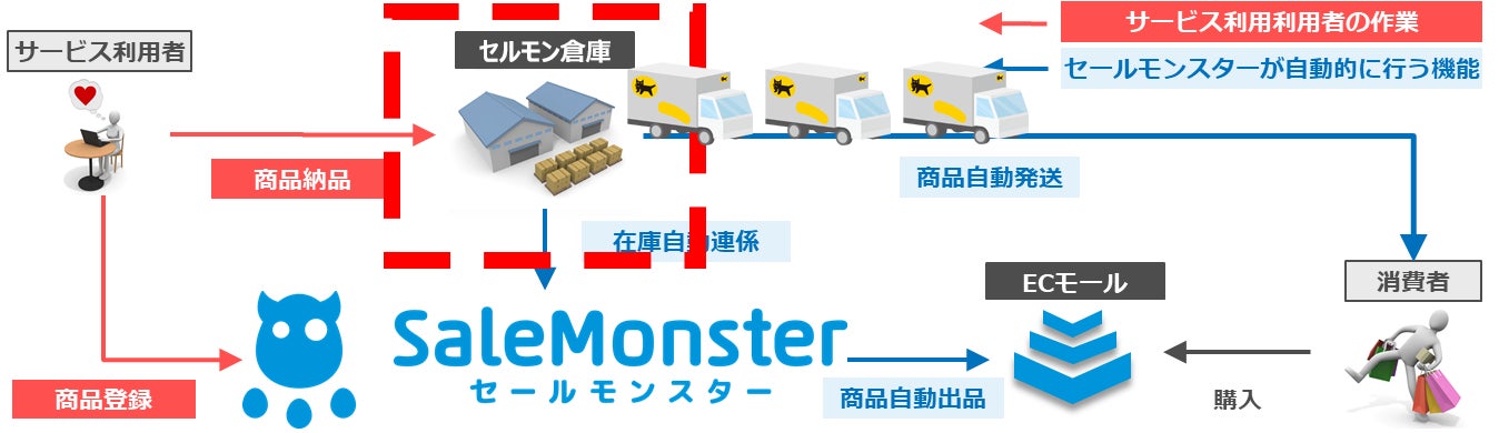 セルモン倉庫は、セールモンスターサービスと連動して利用ユーザがヤマトフルフィルメントサービスを活用するサービスです。