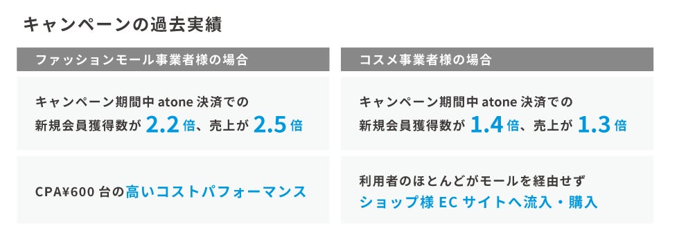 ショップは「atone」の加盟店となることで、会員に向けたキャンペーンを実施したり、商品情報を無料で掲載できるようになります。これにより通常のショップ購買者に加えて「atone」の会員からの新規購入が見込めます。過去に実施した「atone」のキャンペーンにおいては、ショップの「atone決済」での売上が倍増した実績もございます。