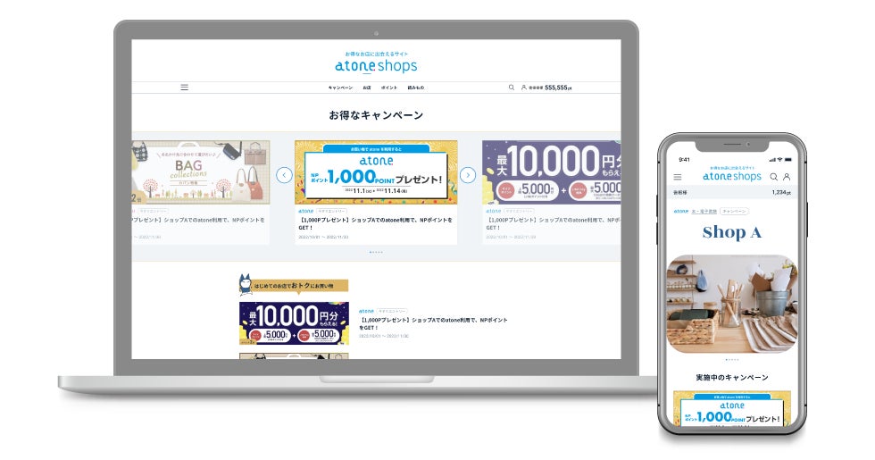 「atone shops」は、後払い決済サービスにおいて、ショップ・キャンペーン・ポイントの3つの情報を集約した日本初(※1)のポータル(WEB)サイトです。「atone shops」を利用することで、会員は自分にあった新しいショップや、実施中のお得なキャンペーンに合わせて買い物を楽しむことが可能になります。