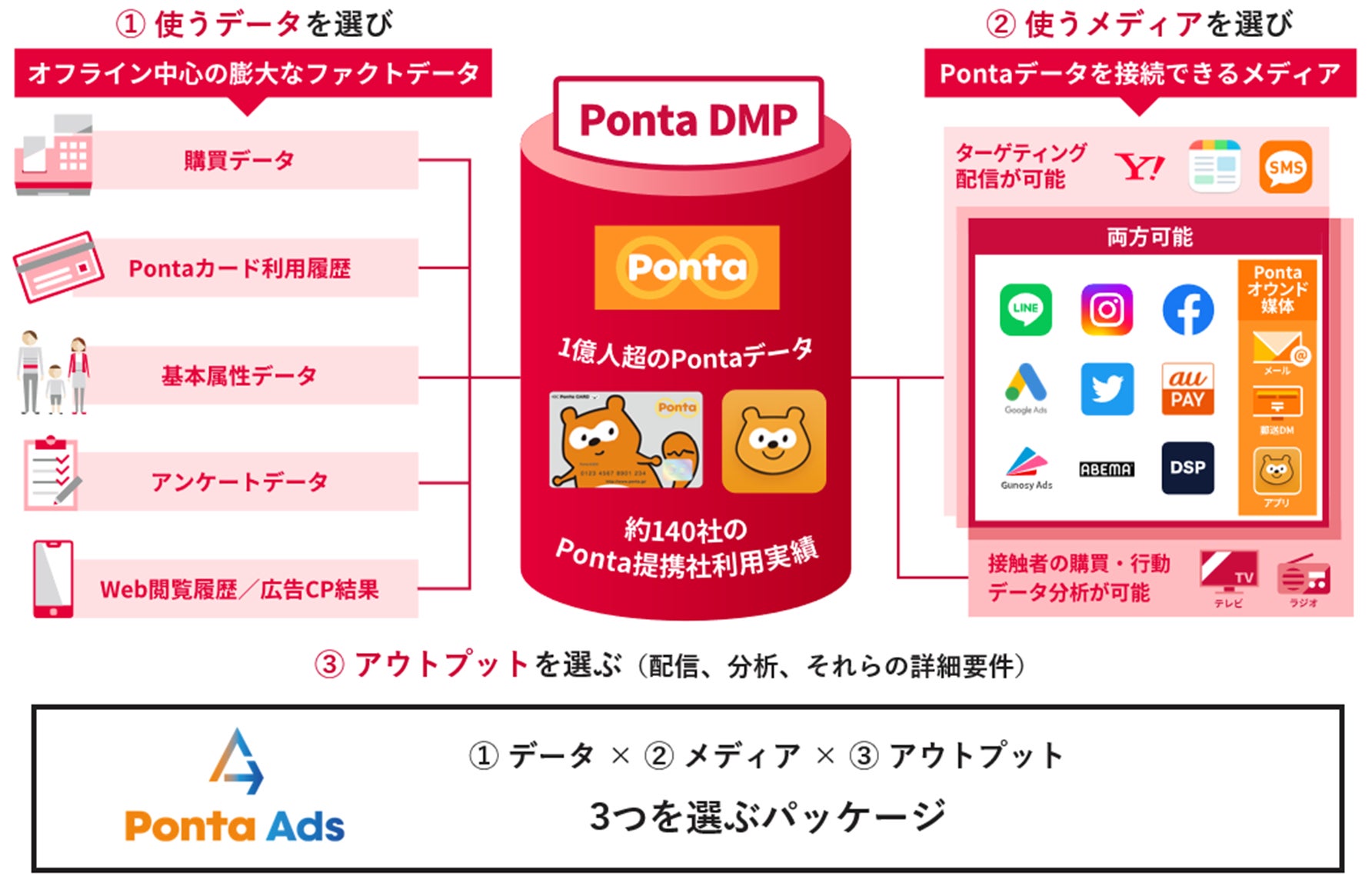 Ponta Adsでは、これらのソリューションをパッケージ化し、①活用するデータを選ぶ、②アプローチするメディアを選ぶ、③アウトプットを選ぶ、の形でサービスを構築しています。