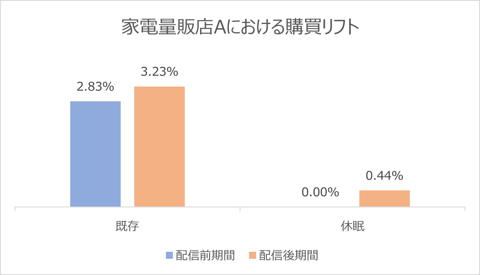 配信後と配信前の家電量販店Aにおける購買率を比較したところ、既存顧客、休眠顧客ともにリフトが見られる結果となりました。本事例の他、購買対象を特定のブランド等に絞って集計することも可能となっております。
