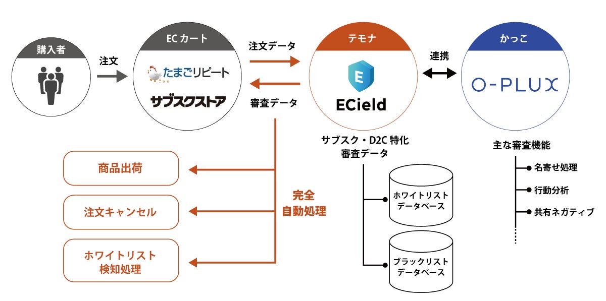 安全なネット通販のインフラづくりに貢献するかっこ株式会社(本社:東京都港区、代表取締役社長CEO : 岩井裕之、証券コード:4166、以下 かっこ)が提供する不正注文検知サービス「O-PLUX(オープラックス)」が、EC事業支援サービスを提供しているテモナ株式会社(本社:東京都渋谷区、代表執行役社長:佐川隼人、証券コード:3985、以下 テモナ)が提供する不正注文検知&自動処理サービス「ECield(イーシールド)」の審査エンジンに採用されましたことをお知らせします。これにより、「ECield(イーシールド)」をご利用の事業者は、システム開発不要で「O-PLUX」を利用できるようになり、いたずら注文・悪質転売・アフィリエイト報酬目的等の不正対策強化につながります。