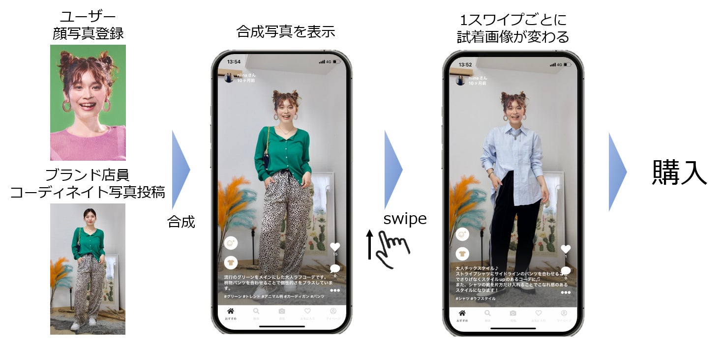 「TIPSNAP」は「スワイプするたび、すぐイメチェン」がコンセプトの、独自のAI画像処理エンジンを駆使したバーチャル試着サービスです。ユーザーがご自身とモデルの顔を入れ替えることで、実際に試着したイメージに近い形で、バーチャル上で試着が可能になります。店舗に行かずに精度の高い試着ができるので、自宅等で周りの目を気にすることなく、思う存分様々なコーディネートを試すことができます。