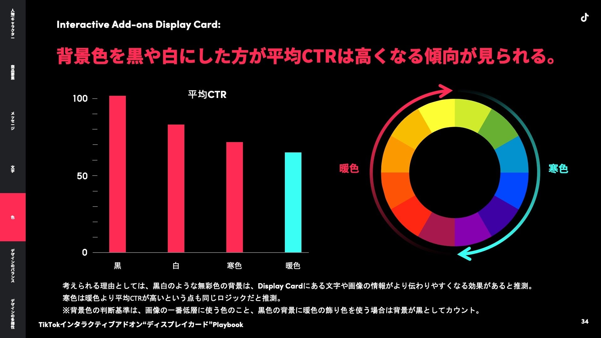 Display Cardの背景色は、黒や白にすると平均CTRが高くなる傾向になります。黒白のような無彩色の背景は、Display Cardの文字や画像の情報がより伝わりやすくなる効果があると考えられ、同様の理由から、寒色と暖色の比較では、寒色の平均CTRが高くなっています。