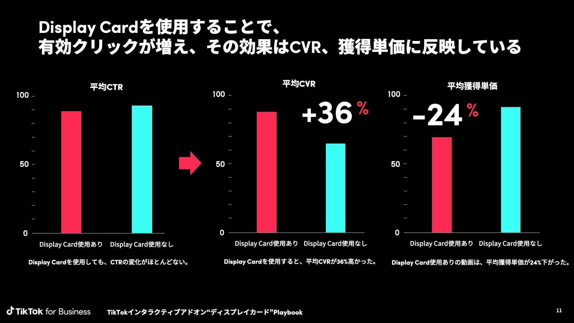 さらに、Display Cardは通常のCTAやハッシュタグよりもクリック可能なエリアを広げ、視認性を高めています。実際、Display Cardの表示エリアでは平均CTRが30%高く、Display Cardからのクリックが動画全体の14%を占め、有効なクリック数の増加に寄与しています。その結果、CVRは36%増加し、平均獲得単価は24%低下しています。