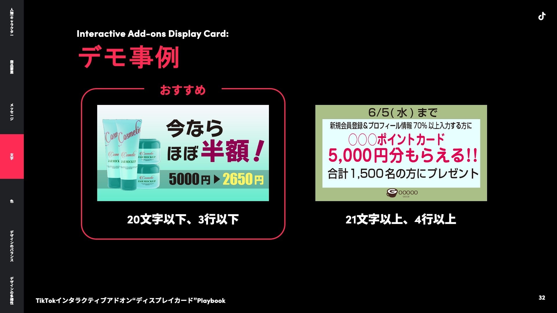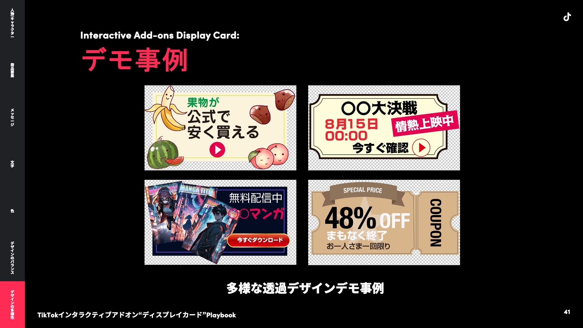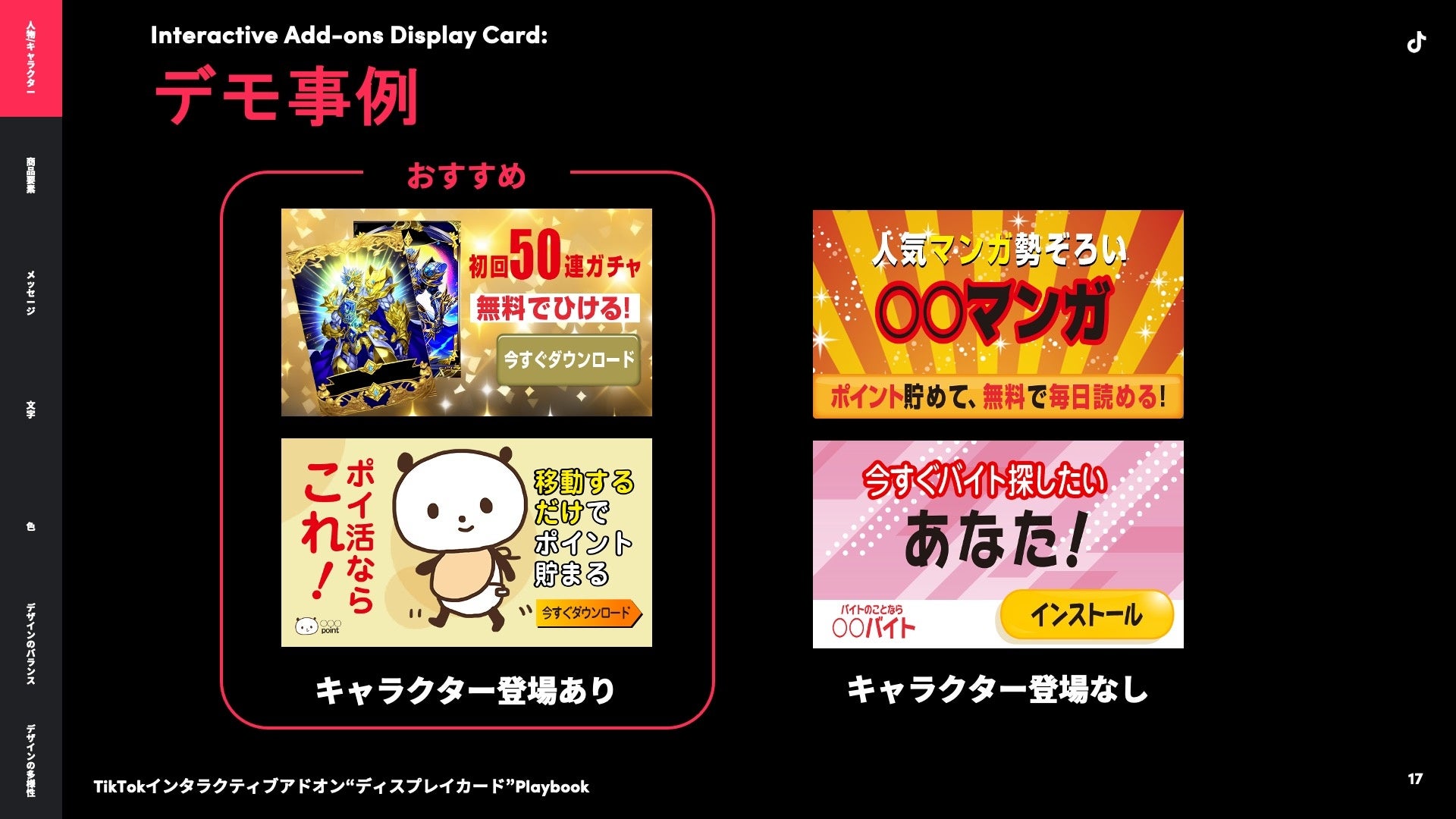 その他にも「商品要素」、「デザインのバランス」に関するクリエイティブのポイントや、マンガ・EC・人材・トラベルなど業界別のデモ画像について「TikTokインタラクティブアドオン“ディスプレイカード” Playbook」にてご紹介しています。