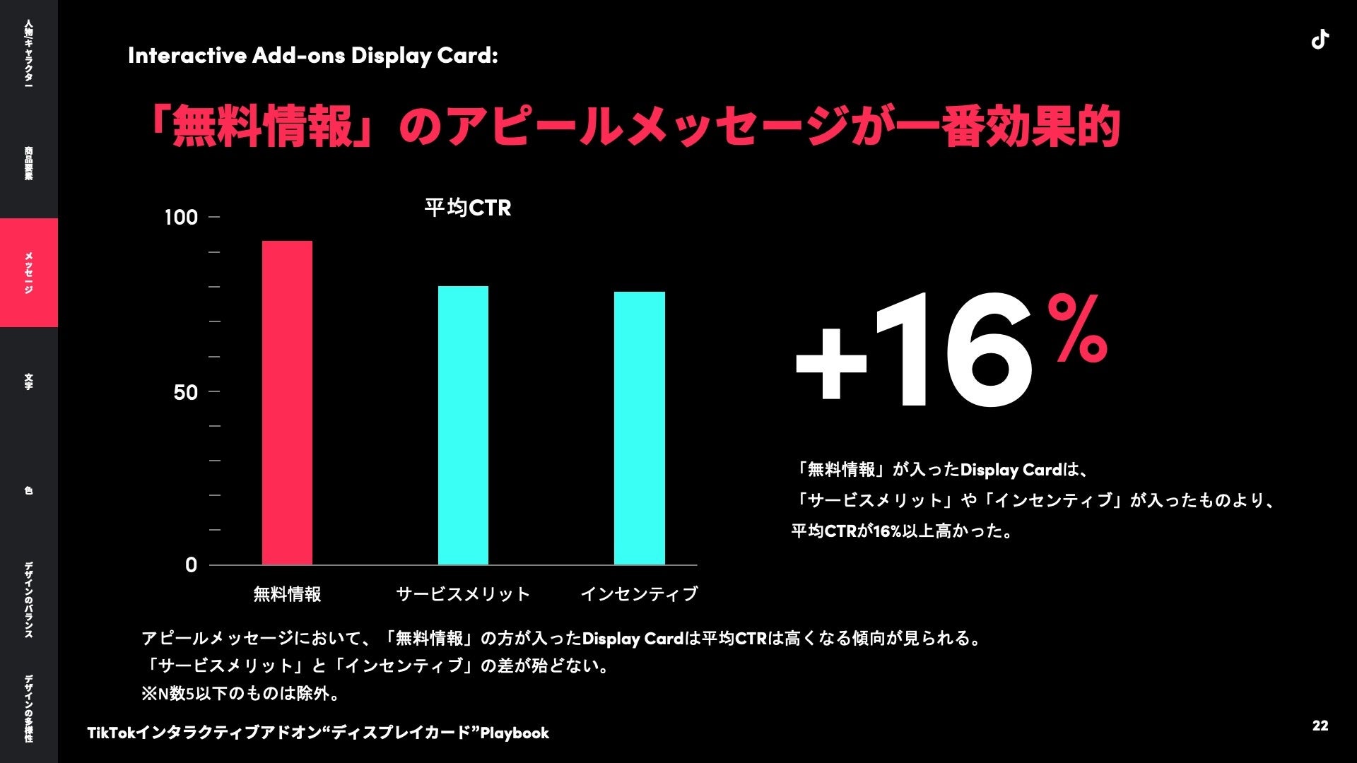 Display Cardに表示するメッセージでは、「サービスメリット」や「インセンティブ」よりも「無料情報」の平均CTRが高くなる傾向にあり、16%高くなっています。