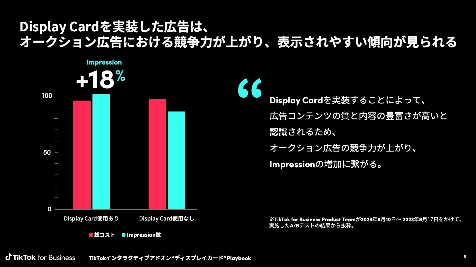 TikTok for Businessでは、2023年1月1日〜7月29日の日本におけるDisplay Cardを利用したTikTok広告を分析しました。この結果をもとにDisplay Cardの効果的な利用法や獲得効率を高めるクリエイティブのポイントをまとめた「TikTokインタラクティブアドオン“ディスプレイカード” Playbook」を公開しました。