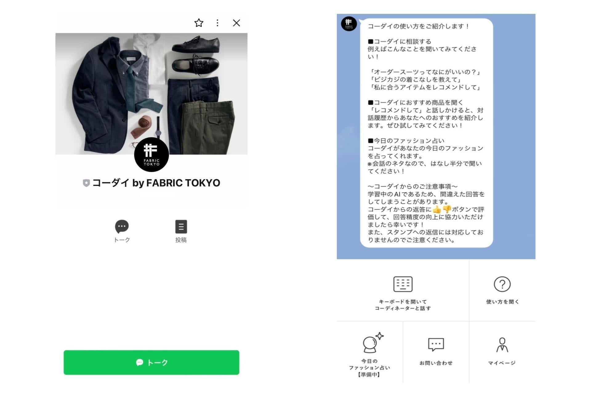FABRIC TOKYO独自のパーソナルデータを学習したAI「コーダイ by FABRIC TOKYO」により、お客さまはLINE公式アカウントのトークルーム上で、店舗でコーディネーターへ相談するように、自分自身にパーソナライズされた提案を受けることで、快適な購買体験を得られるようになります。