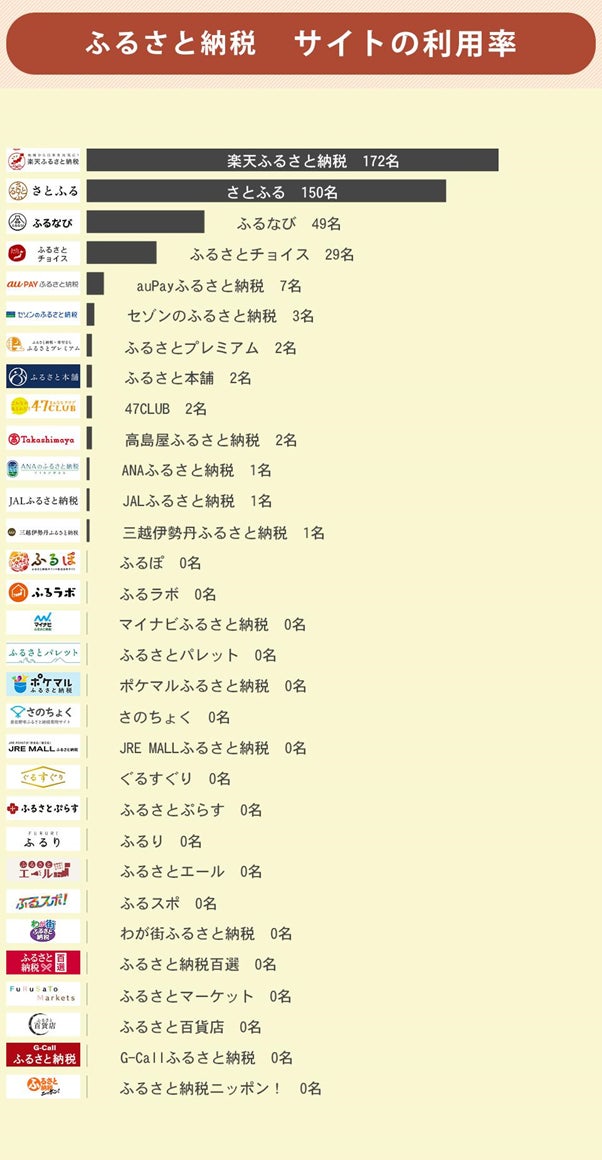 ふるさと納税ポータルサイトのうち31サイトの利用率調査をしたところ、『さとふる』と『楽天ふるさと納税』の利用率が高い結果となりました。