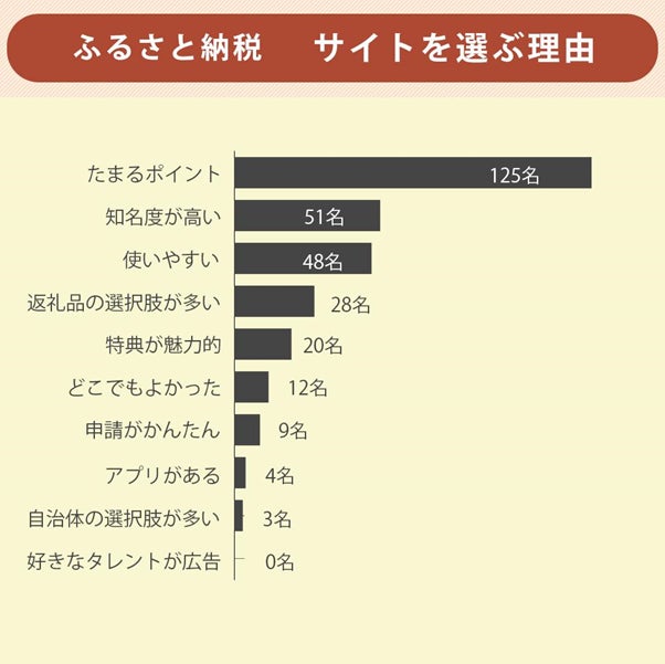 ふるさと納税サイトを選ぶ基準では「たまるポイント」を重視する利用者が多いことが分かりました。