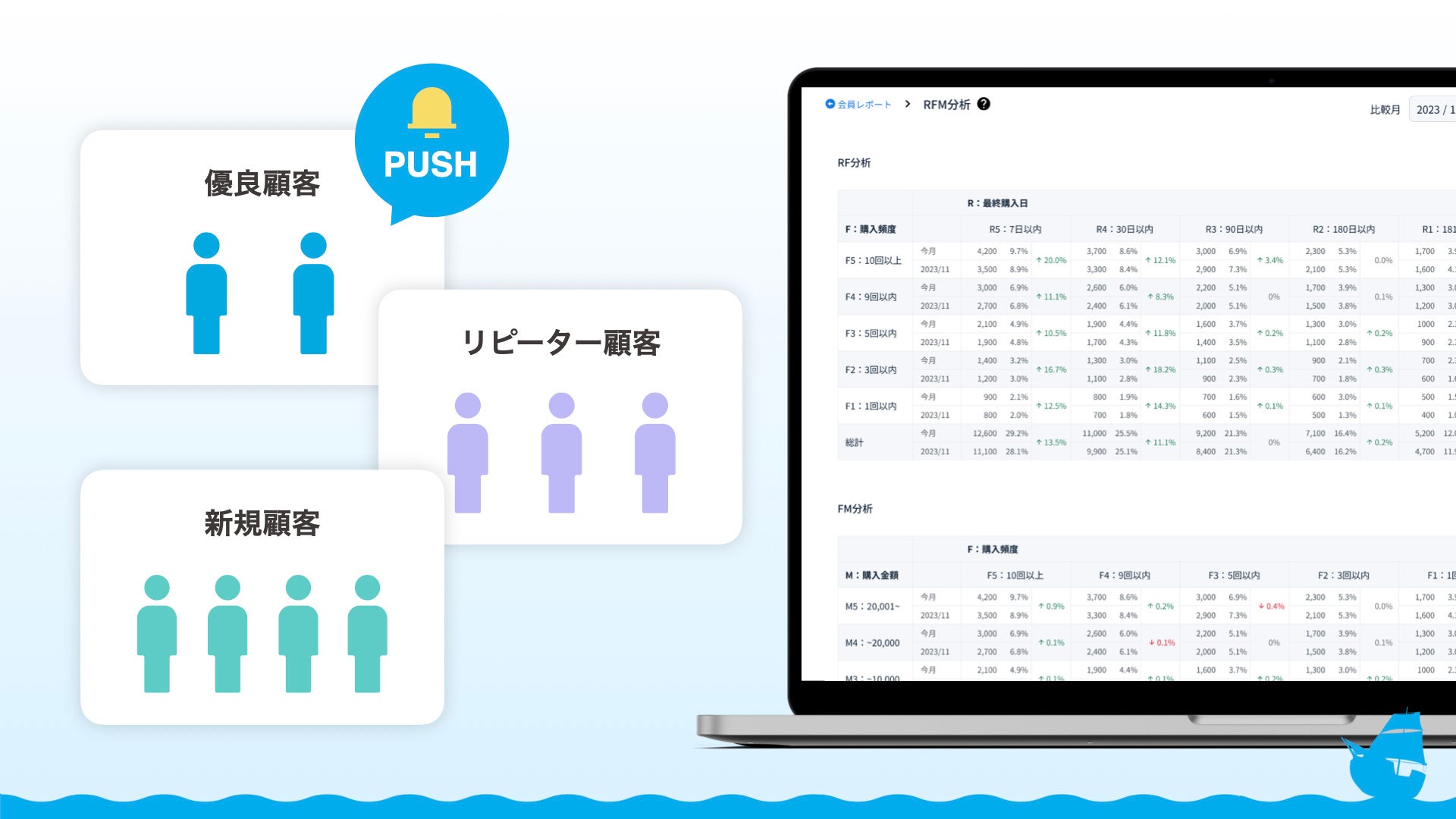最終購入日、購入頻度、購入ボリューム(金額)の3つの指標で顧客を分類します。顧客の購買データをCRMに連携して管理を行い、そのRFMランクの可視化、推移のレポートの提供、顧客ランク(優良顧客・リピーター顧客・新規顧客など)ごとにトリガー施策やプッシュ配信が可能になります。