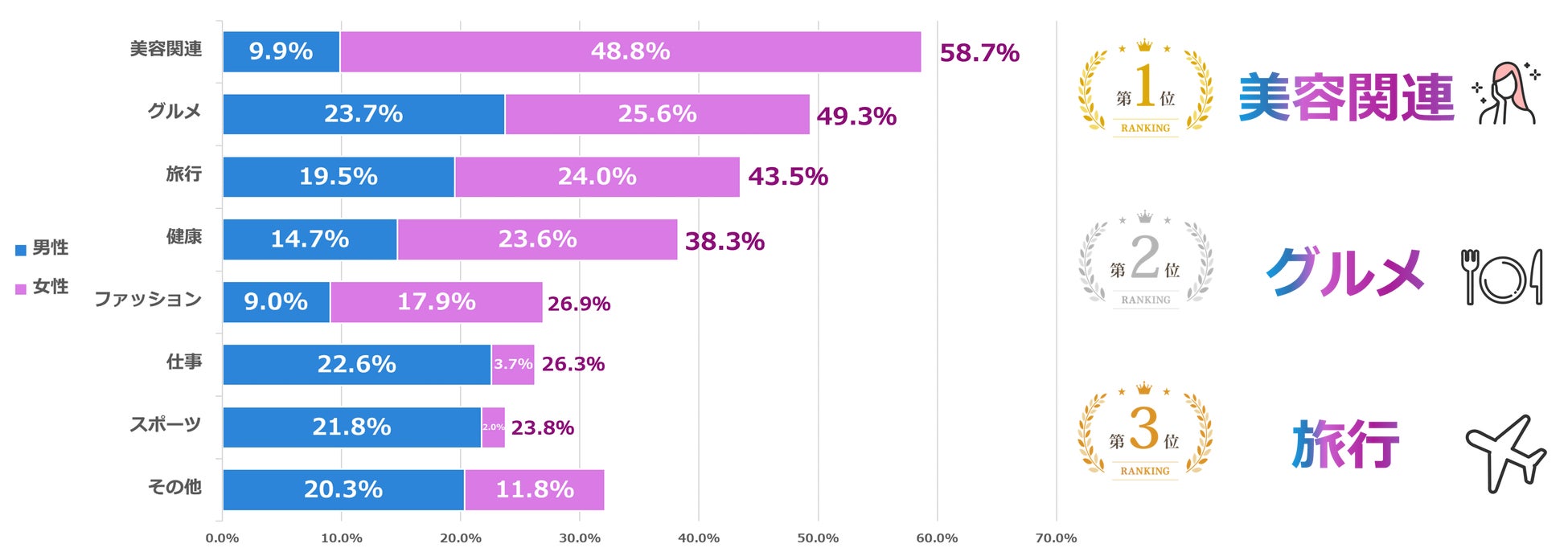 それに次いでグルメ、旅行、健康に関する情報に対して興味を持つことが判明。