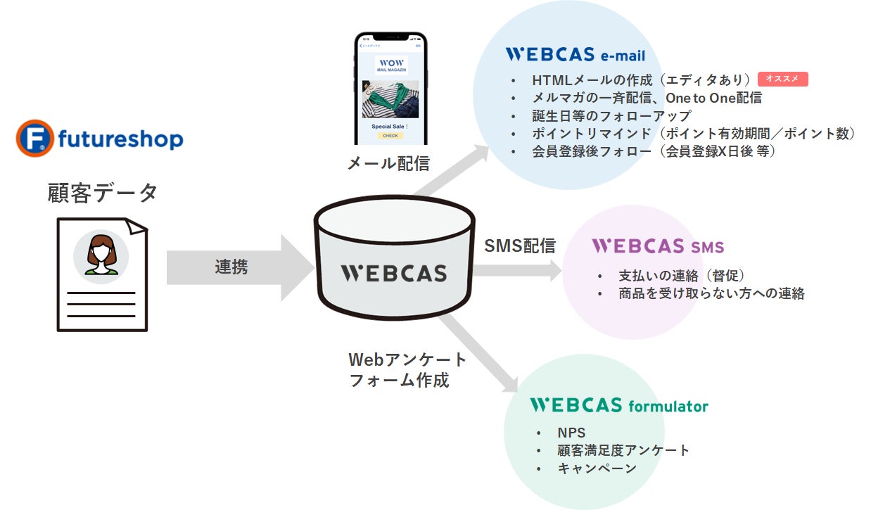 この連携により、「futureshop」または「futureshop omni-channel」(以下、futureshop)をご利用中のEC事業者さまは、蓄積された顧客データを参照してWEBCASでメール配信やSMS配信ができるようになりました。