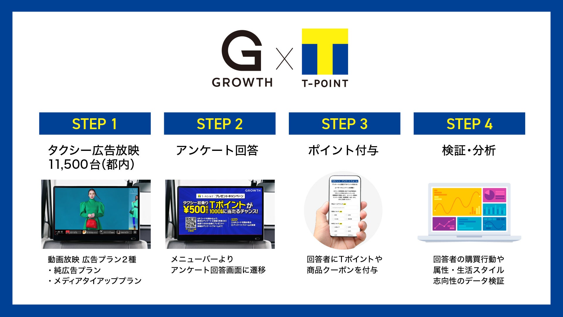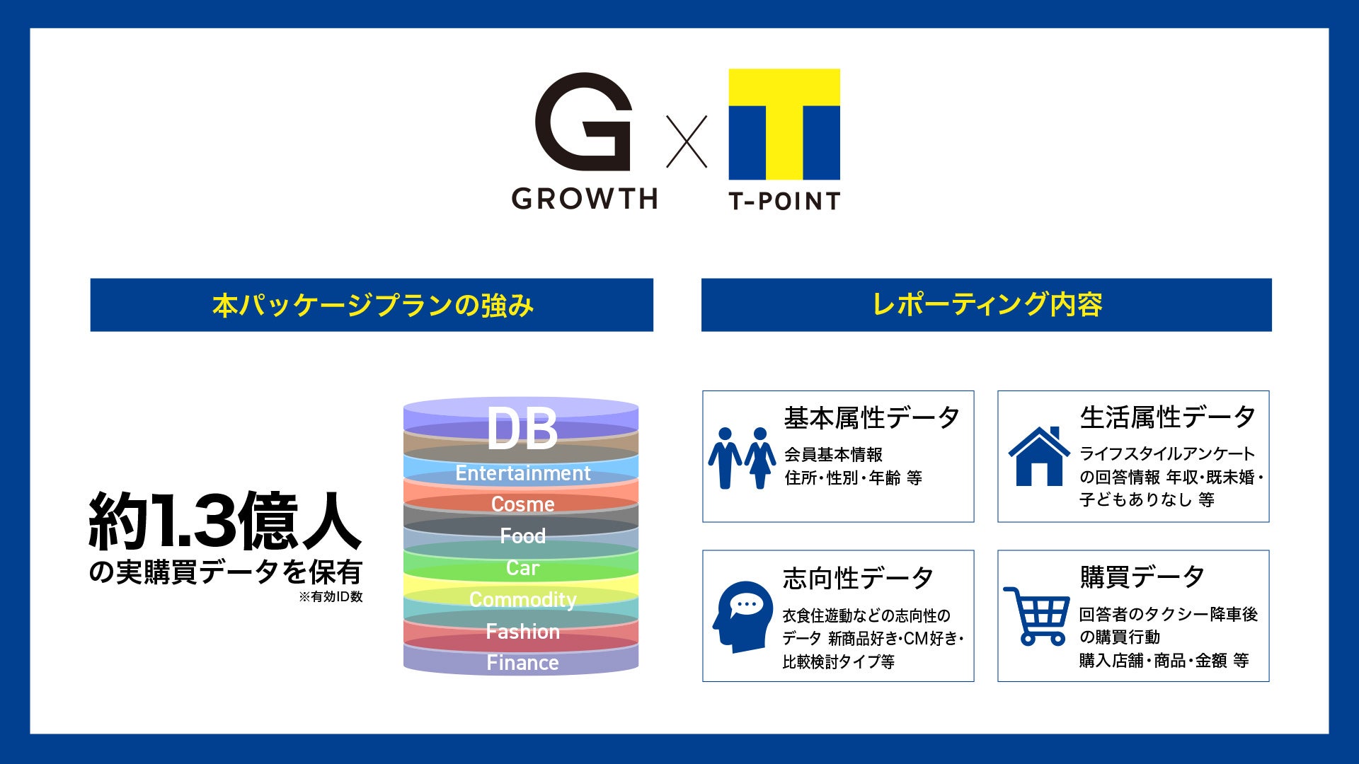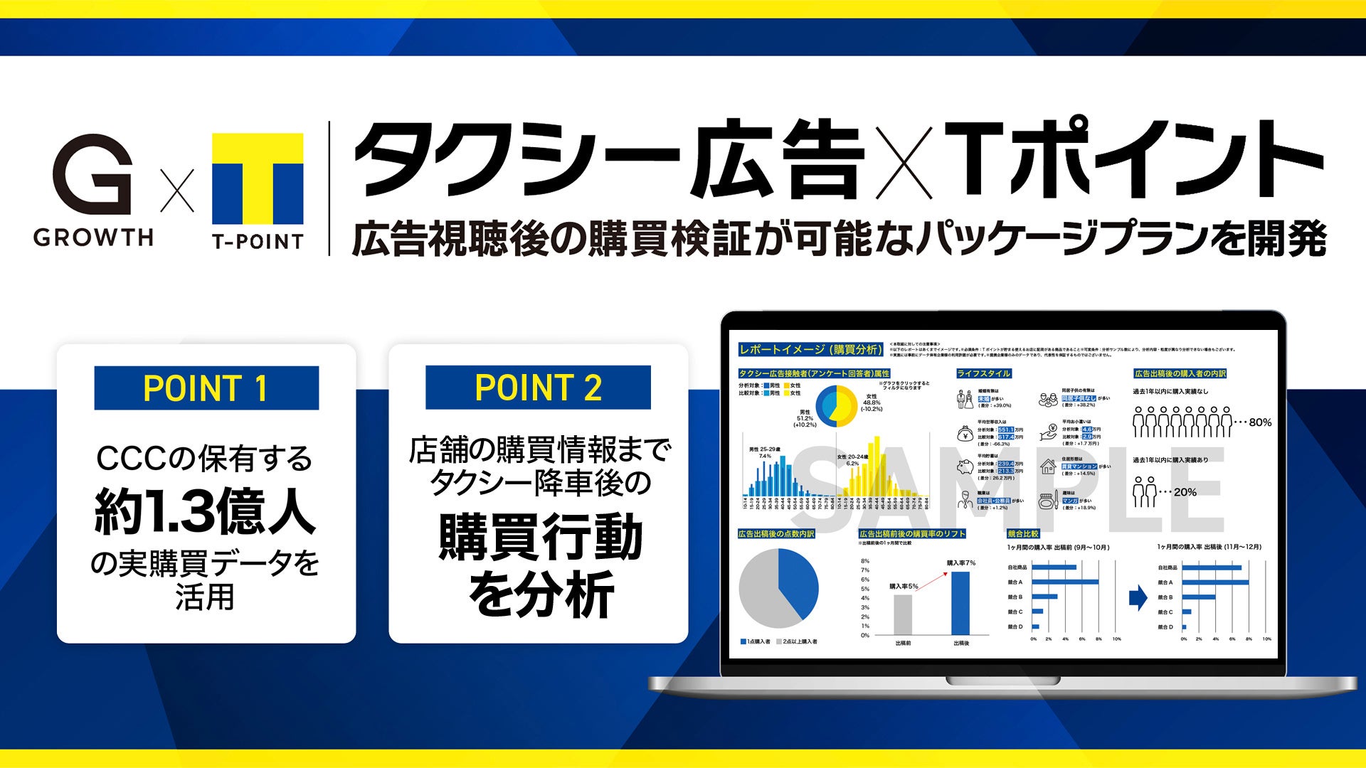 都内最大級※1のタクシーサイネージメディア「THE TOKYO TAXI VISION GROWTH」(以下「GROWTH」)を運営する株式会社ニューステクノロジー(本社:東京都港区、代表取締役:三浦純揮、以下「ニューステクノロジー」)と、共通ポイント「Tポイント」を運営するCCCMKホールディングス株式会社(本社:東京都渋谷区、代表取締役社長 兼 CEO:髙橋誉則、以下「CCCMKHD」)は、タクシーユーザーの広告視聴後の購買検証が可能な共同パッケージプランを2023年10月12日(木)より提供を開始します。都内11,500台のタクシーと約1.3億人※2が利用するTポイントの大規模データを掛け合わせ、タクシーサイネージにおける新たなマーケティングソリューションを提供します。