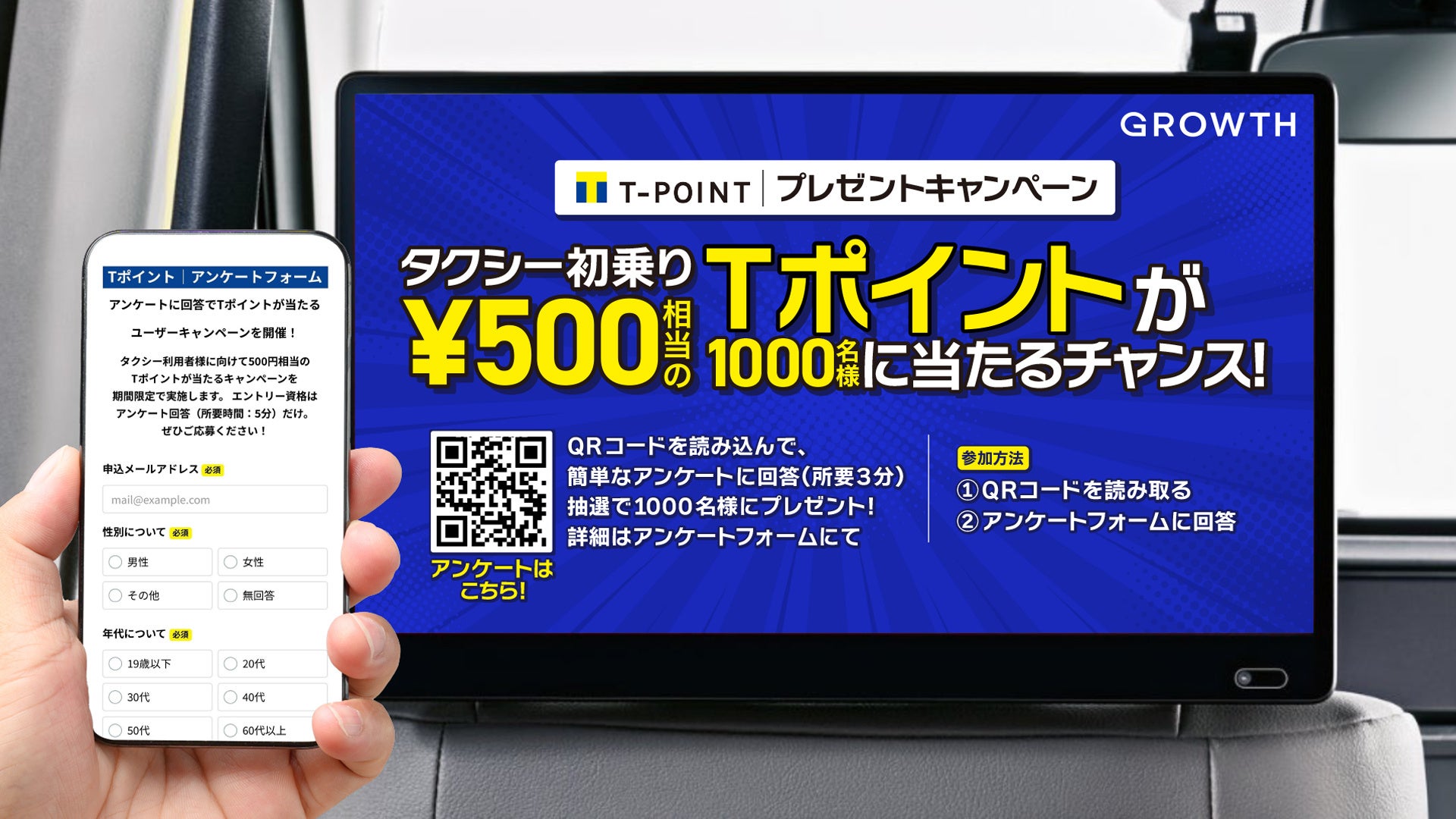 本プランでは、タクシーサイネージメディア「GROWTH」で商品を訴求する動画放映に加えて、タブレット下部のメニューバーより、アンケートに回答することで「Tポイント」や特定の商品のクーポンが当たるユーザーキャンペーンの開催が可能になります。回答者のアンケート結果及びその後の購買行動を検証し、レポーティングを行います。