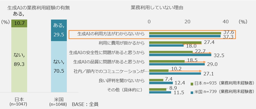 さらに生成AIを認知している人へ生成AIの業務利用経験についてたずねたところ、利用経験があると答えた人は日本で10.7%、米国で29.5%と差のある結果となりました。そこで、業務利用未経験者に、利用していない理由を尋ねたところ、日米ともに、40%弱の人が「生成AIの利用方法がわからないから」と回答しました。また、米国では日本より、「社内/部内でのコミュニケーションが不足するから」や、「生成AIの安全性/品質に問題があると思うから」を利用していない理由として挙げる人が多く、一方、日本では米国より「利用に費用が掛かるから」を理由として回答する人が多い結果となりました。(図3)