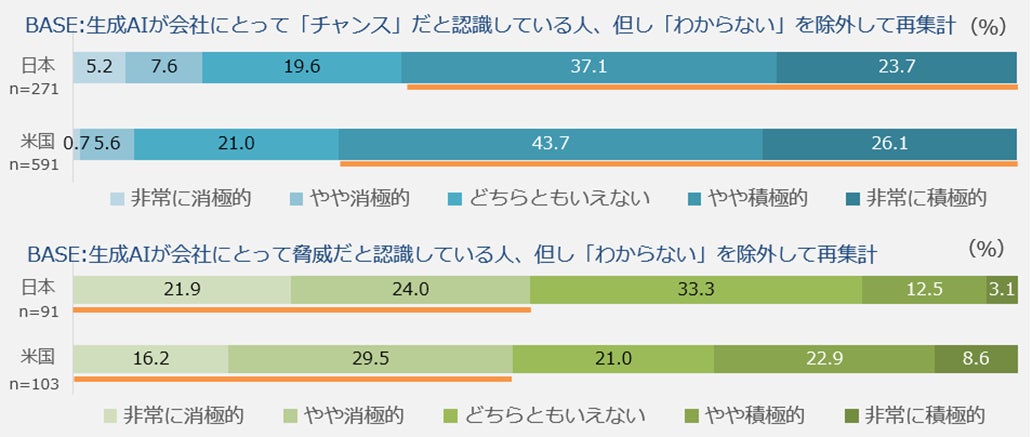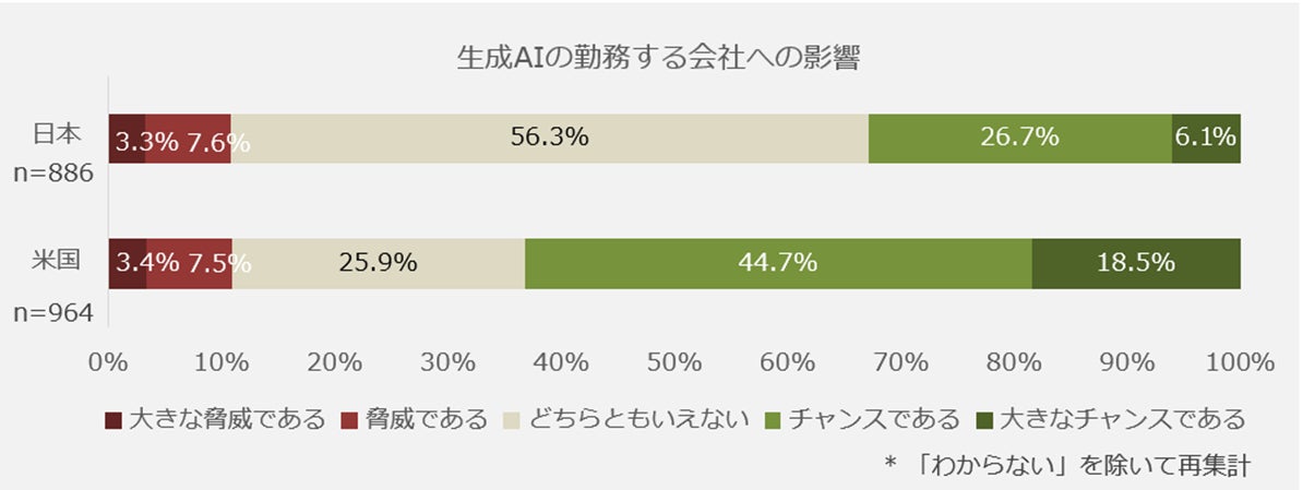 ・勤務する会社への生成AIの影響を「チャンス」と考える人は、米国は日本の約2倍