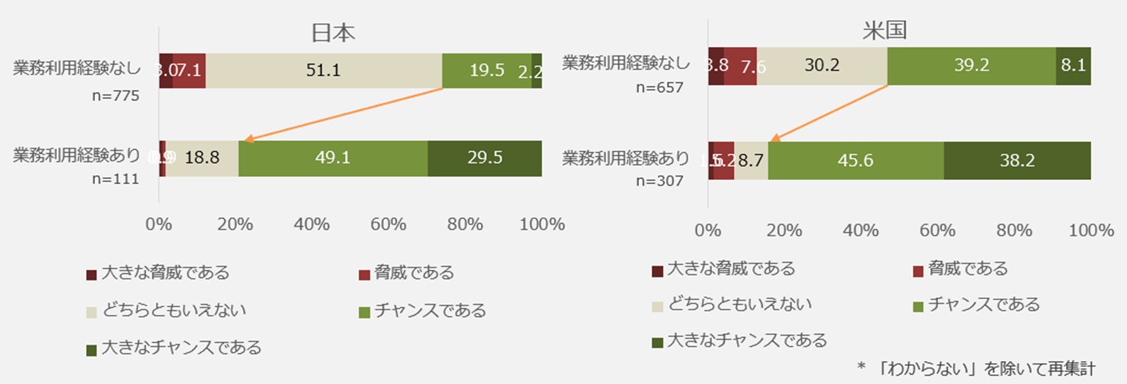 さらに、生成AIの業務利用経験の有無別にみると、業務利用経験者は未経験者と比較して、自社への生成AIの影響について「チャンス」だと認識する人の割合は、日本56ポイント、米国36ポイントと増加しています。(図6)
