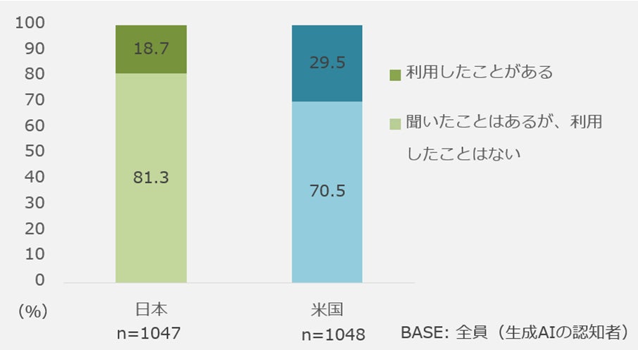 また、生成AIを認知している人のうち、業務利用や個人的な利用などで既に利用経験のある人は、日本18.7%、米国29.5%と、やや米国の方が生成AIの活用が進んでいることがわかりました。(図2)