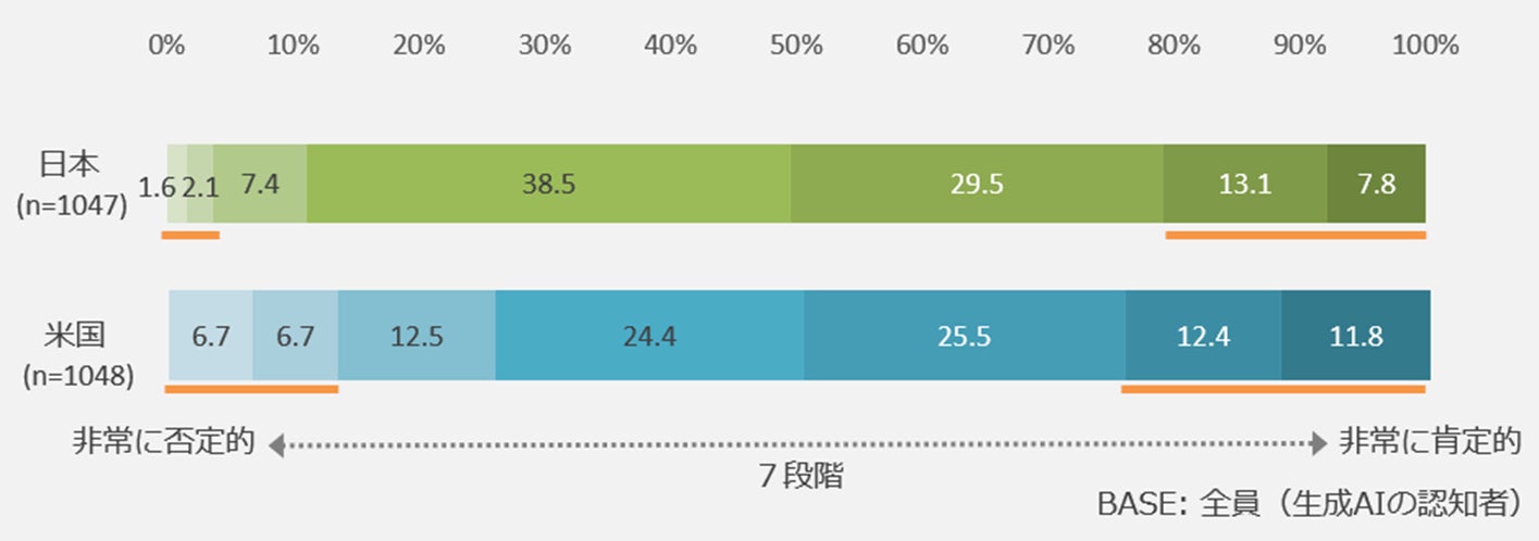 米国における肯定・否定の意識の両極化の背景は、生成AIの利用および理解が進んでいるため、はっきりとした意識を抱いている人が多いと推測することができます。