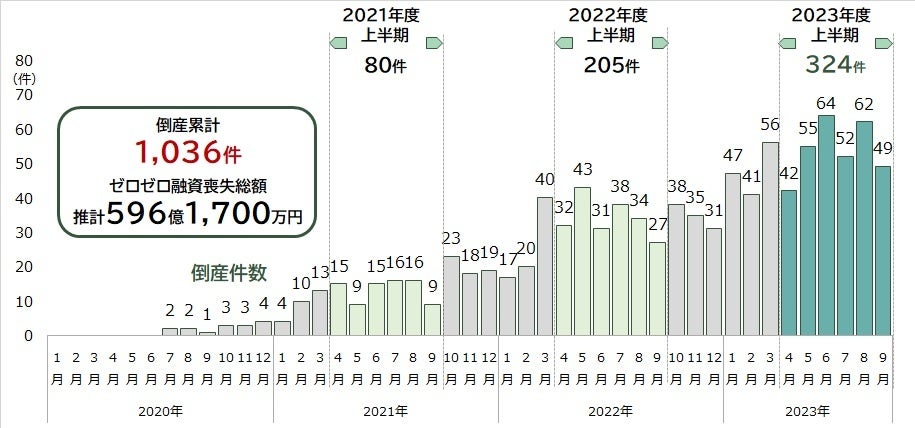 2023年度上半期の「ゼロゼロ(コロナ)融資後倒産」は、324件(前年同期205件、58.0%増)発生、年度半期ベースで過去最多を更新した。また、実際の融資額が判明した約330社のゼロゼロ融資借入額の平均は約5800万円となり、「不良債権(焦げ付き)」に相当するゼロゼロ融資喪失総額は推計で約596億1700万円にのぼった。