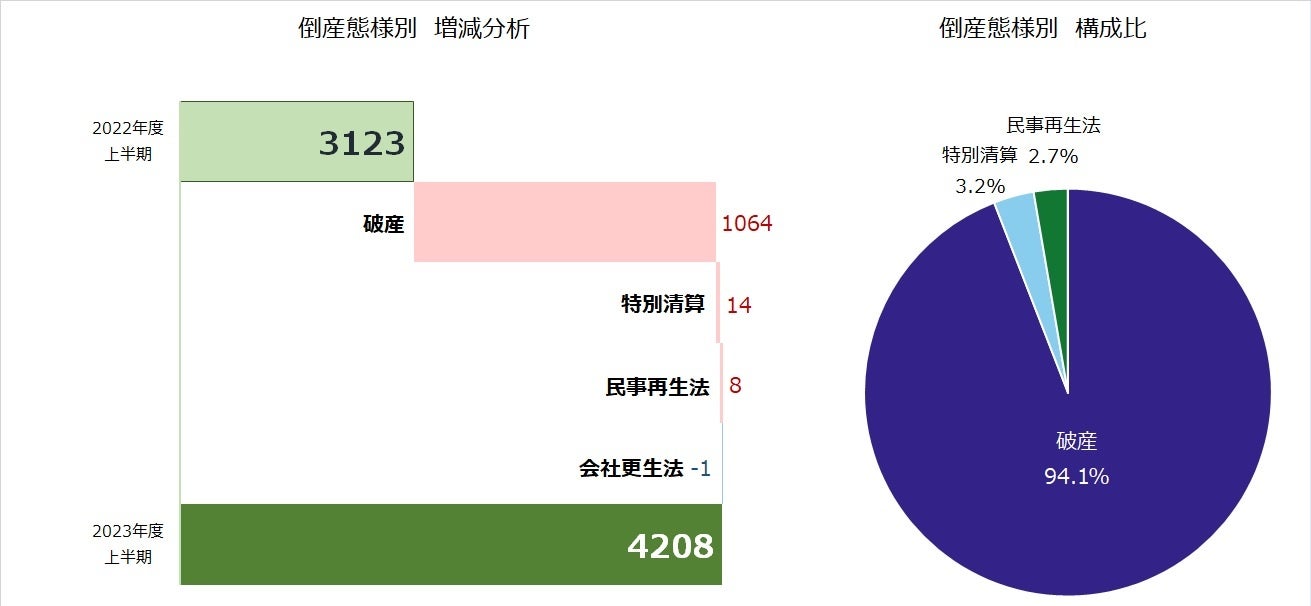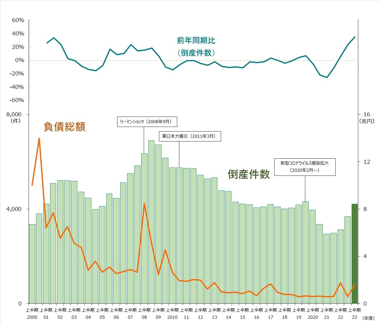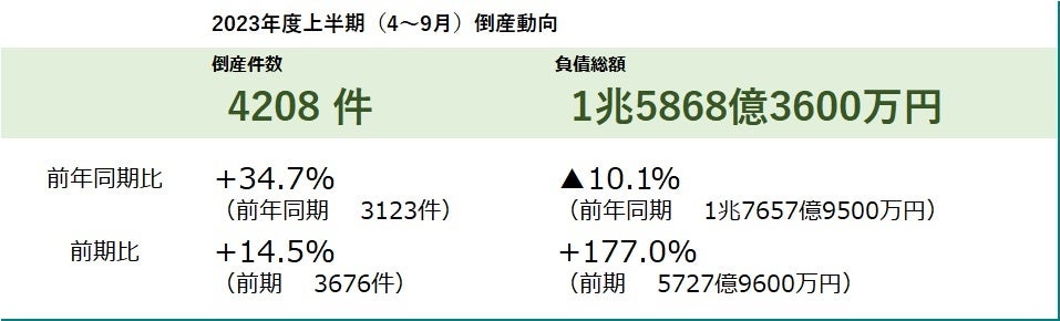 - 2023年度上半期の倒産件数は4208件(前年同期3123件、34.7%増)と、上半期としては2年連続で前年を上回り、4年ぶりに4000件を超えた。前年同期を34.7%上回るなど、増加率(年度半期ベース)は2000年度以降で最も高くなった