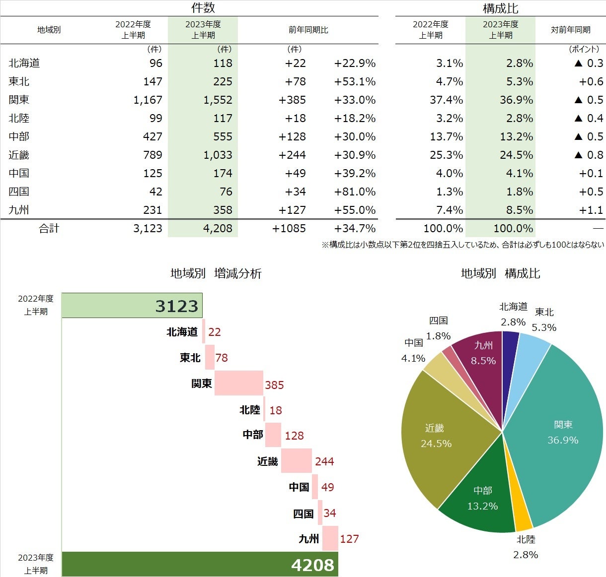 - 地域別にみると、15年ぶりに全9地域で前年同期を上回った。『北海道』(前年同期96件→118件、22.9%増)、『東北』(同147件→225件、53.1%増)、『関東』(同1167件→1552件、33.0%増)、『九州』(同231件→358件、55.0%増)では、2019年度上半期を超えた