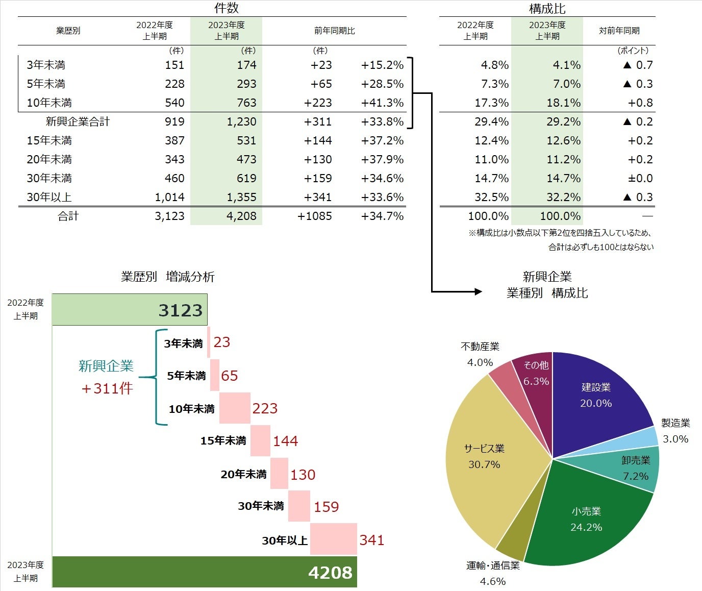 - 業歴別にみると、『新興企業』が1230件で、上半期としては10年ぶり1200件を超えた