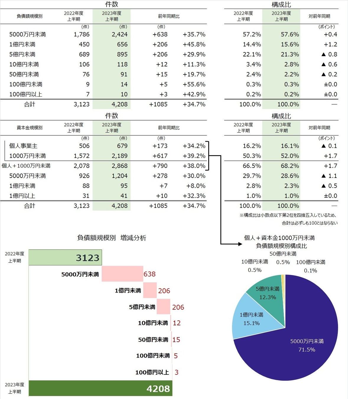 資本金規模別では、『1000万円未満(個人事業主含む)』の倒産が2868件(前年同期2078件、38.0%増)発生し、全体の68.2%を占めた。