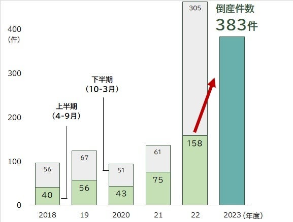 2023年度上半期の物価高(インフレ)倒産は、383件(前年同期158件、142.4%増)だった。前年同期から約2.4倍に急増し、このペースで推移すれば、11月にも前年度(463件)を上回る見込み。主因別では、「原材料」や「エネルギー」コスト高騰などが多数を占めたが、「人件費」の上昇による倒産が前年同期の約3倍となった。