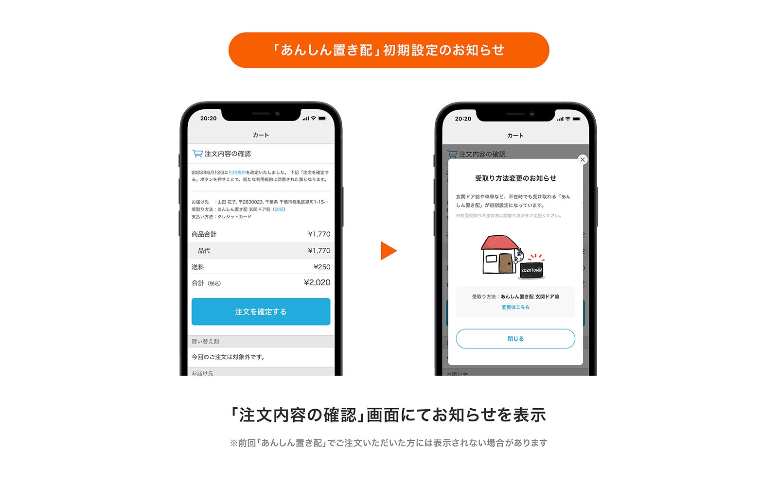 ■変更点:受け取り方法の初期設定を「対面で受け取り」から「あんしん置き配(玄関前)」に変更。
