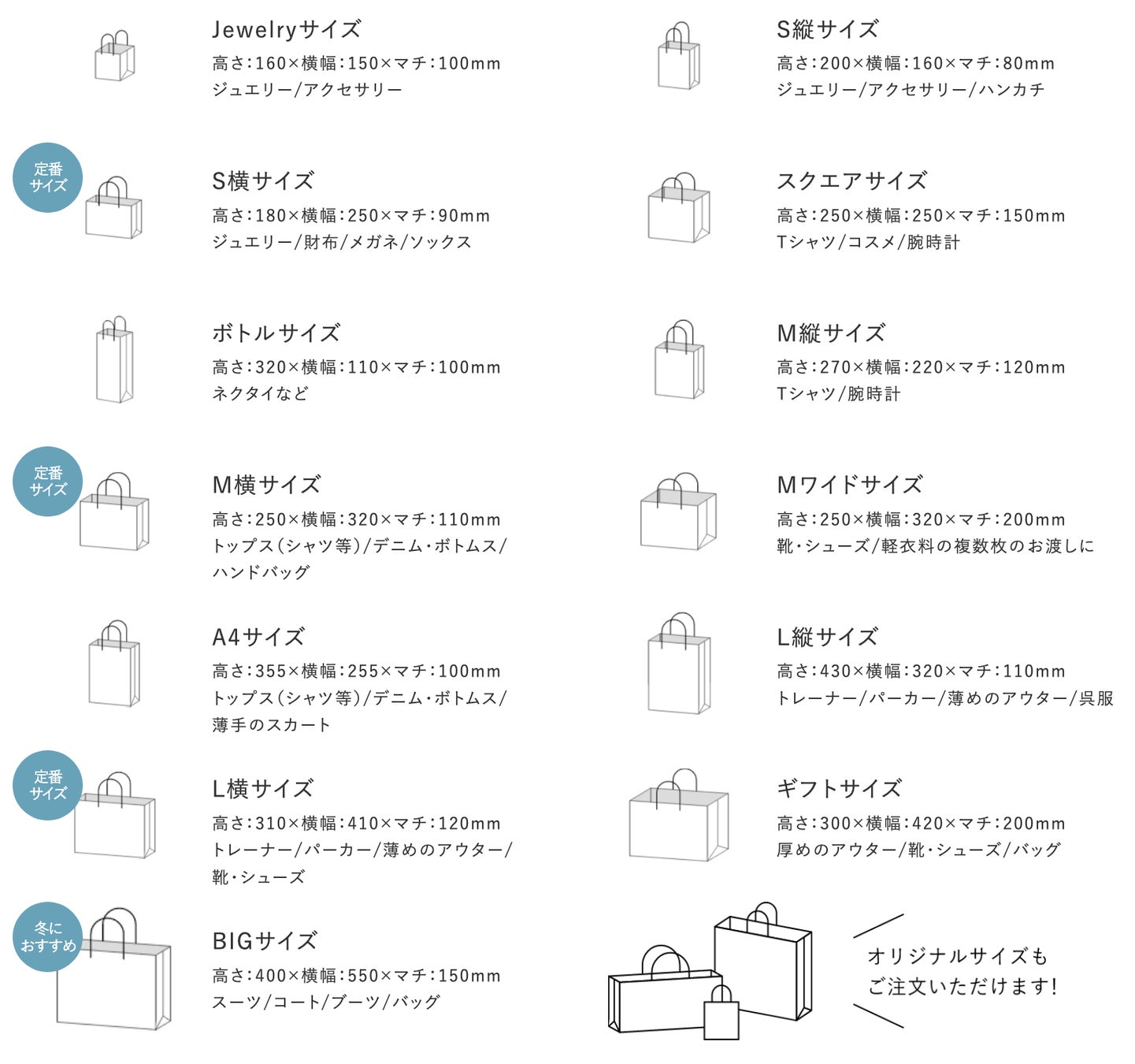 選べるサイズは、商品カテゴリーの多いアパレル業界に対応できるよう、定番の13 サイズをセレクトしています。