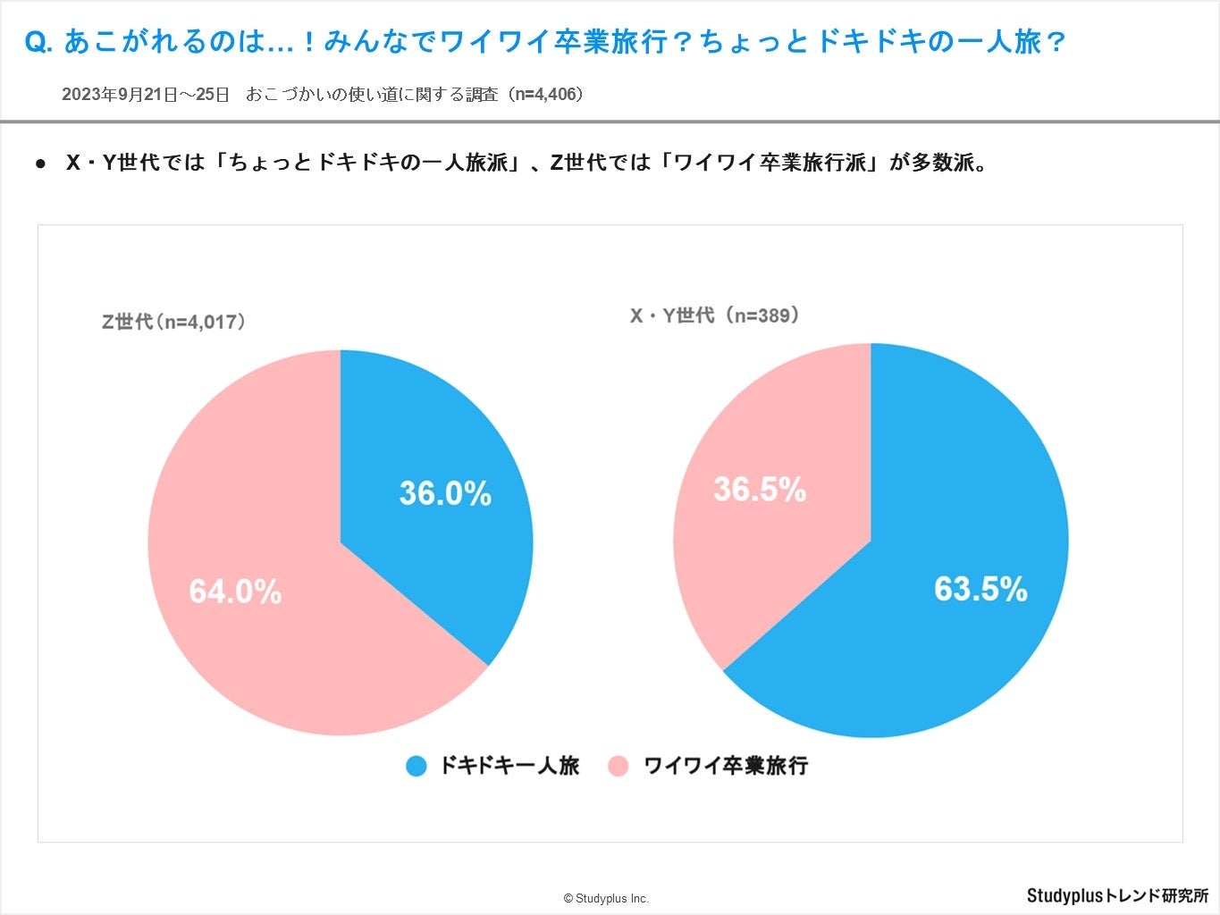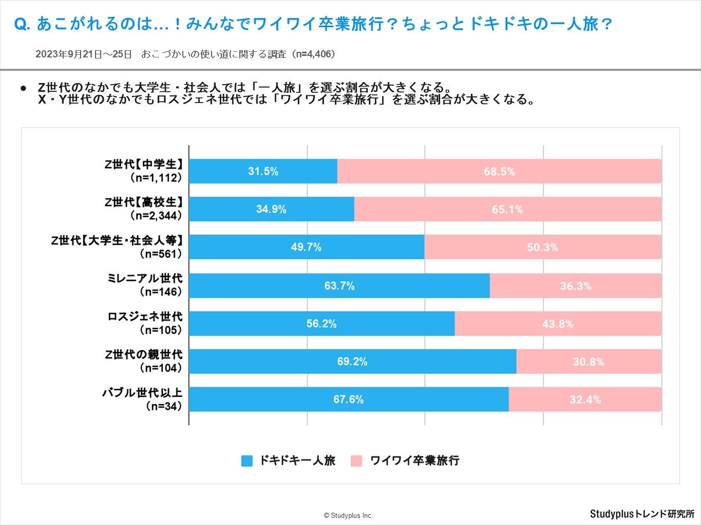 ・X・Y世代では「ちょっとドキドキの一人旅派」、Z世代では「ワイワイ卒業旅行派」が多数派。