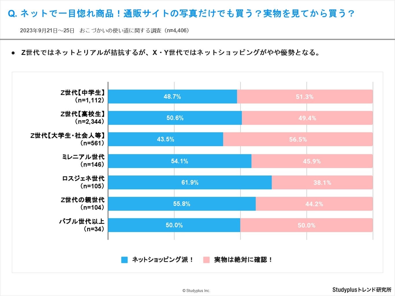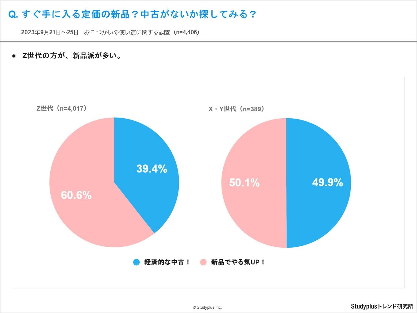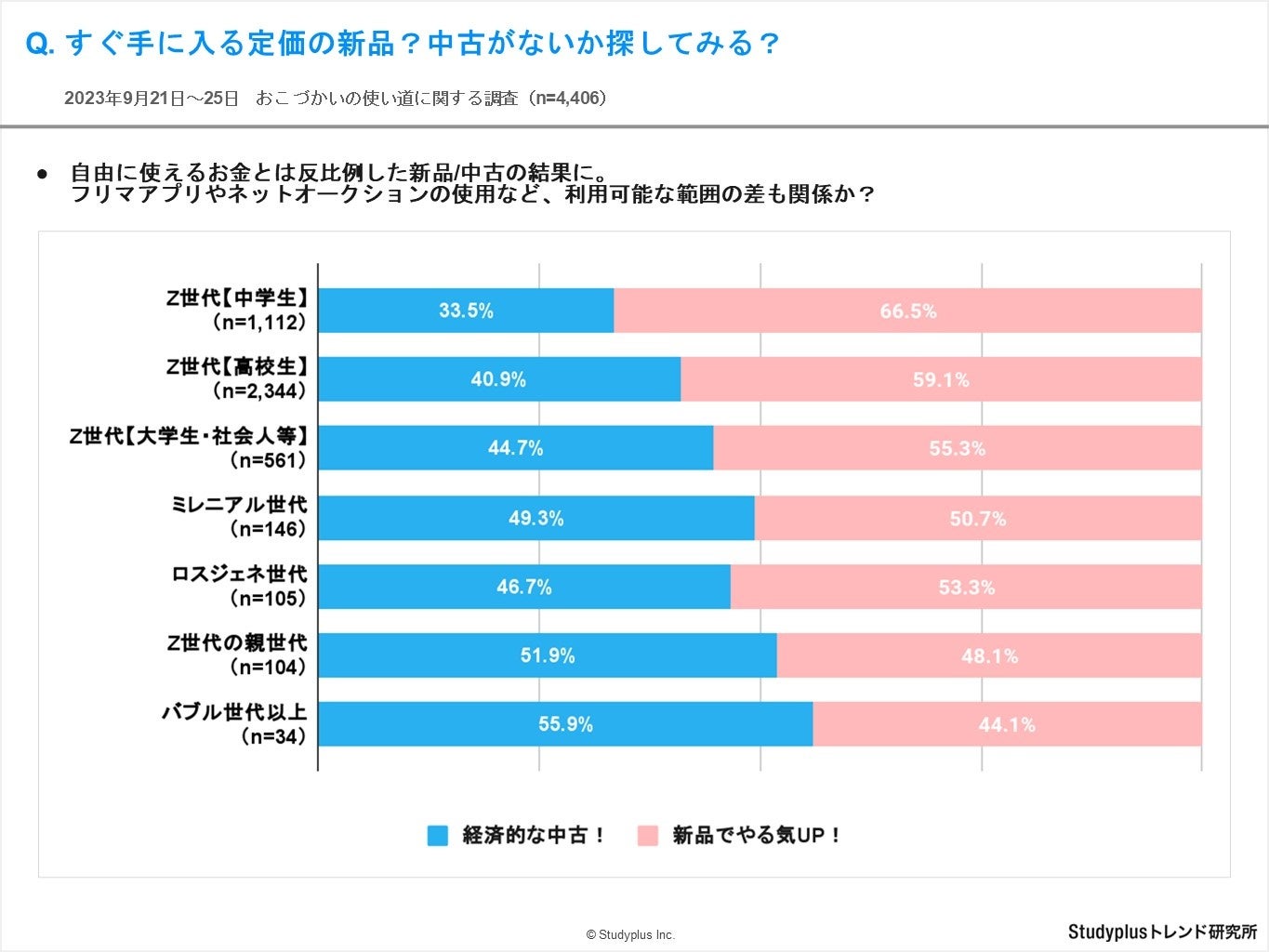 2つ目は、「新品 or 中古品」の調査項目における、中高生含むZ世代では「新品」が多数派という結果です。こちらの調査でも、年齢とともに徐々に「中古品」の割合が高まっています。Studyplusトレンド研究所で2023年8月に実施した「おこづかいに関する調査」では、ネットフリマ・オークションサービスを「よく使っている」割合が中高生では1割程度という結果もあり、年代ごとのネットサービスの普及率や利用可能な範囲の差も、影響しているのかもしれません。