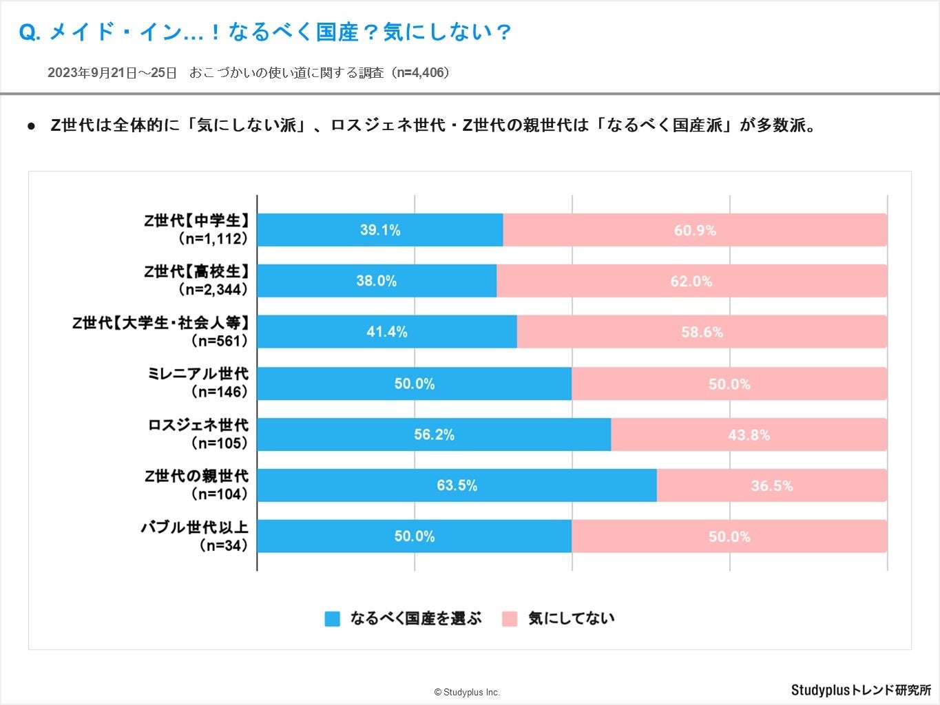 ・Z世代は全体的に「気にしない派」、ロスジェネ世代・Z世代の親世代は「なるべく国産派」が多数派に。