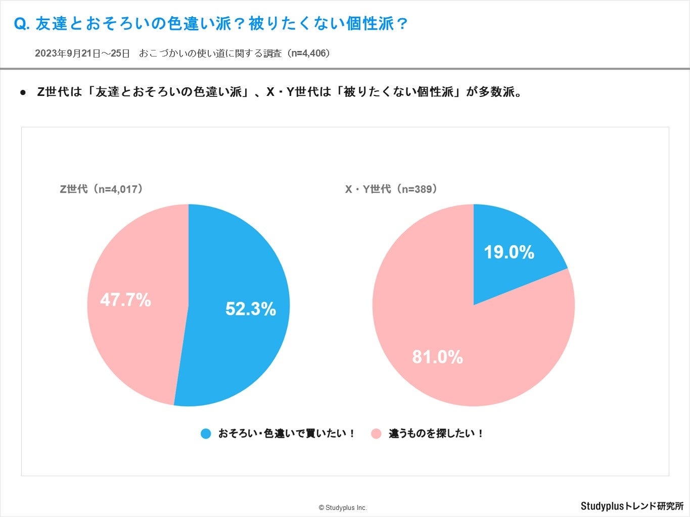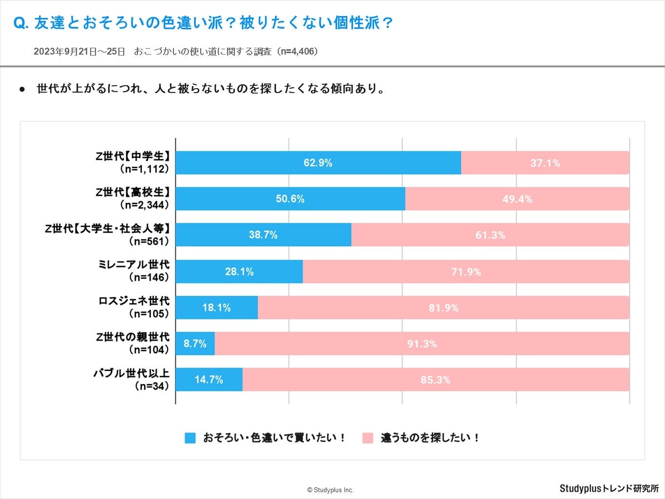 ・Z世代は「友達とおそろいの色違い派」、X・Y世代は「被りたくない個性派」が多数派。世代が上がるにつれ、人と被らないものを探したくなる傾向あり。