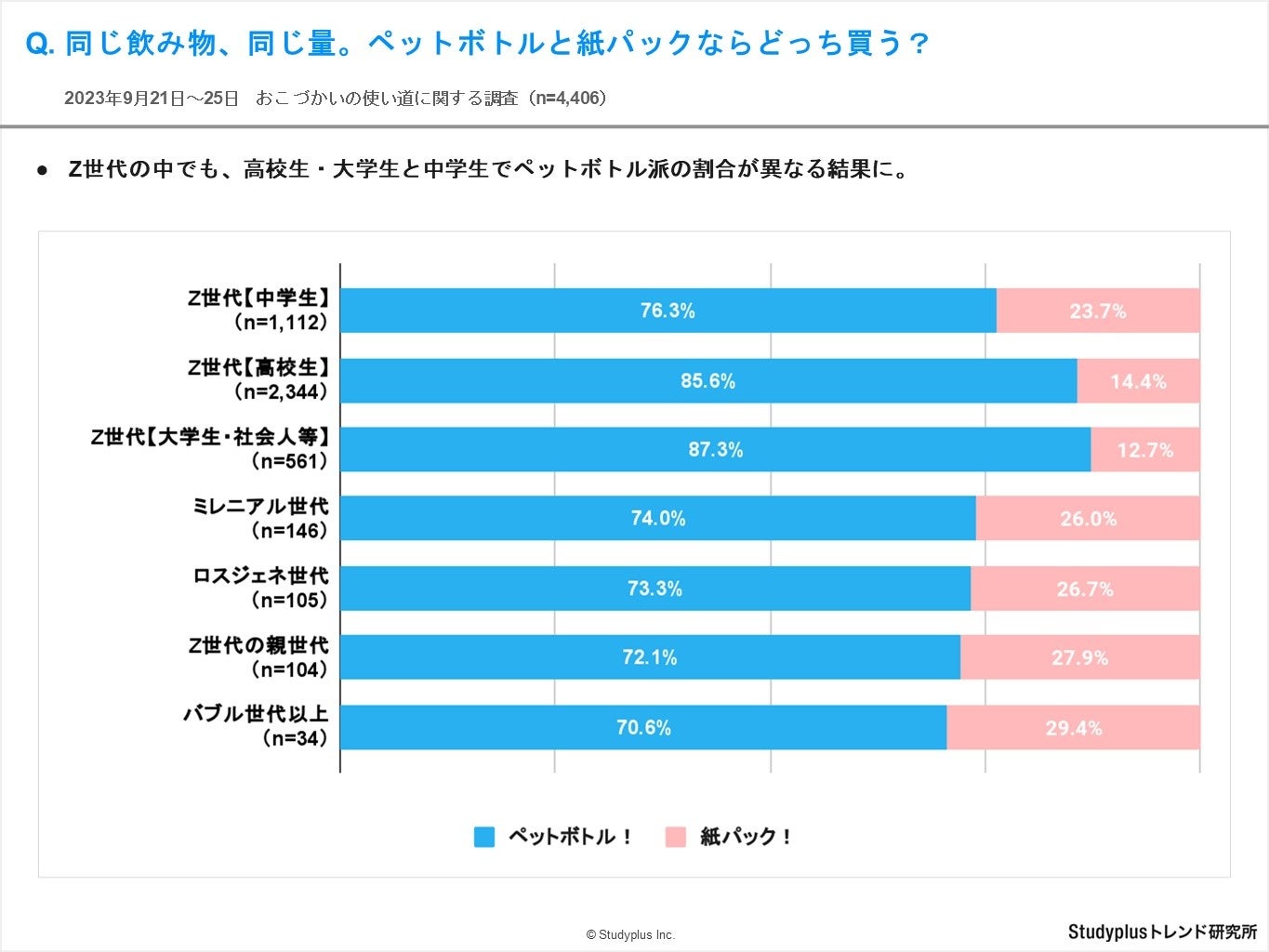・Z世代の方がペットボトル派の割合が多い。Z世代の中でも、高校生・大学生と中学生でペットボトル派の割合が異なる結果に。