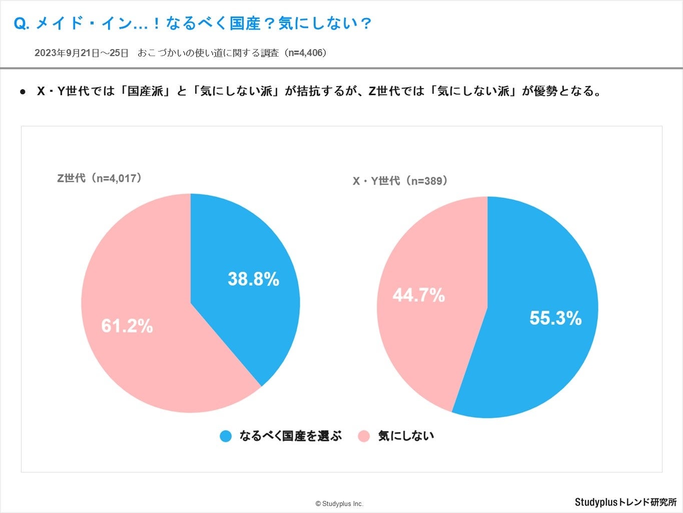 ・X・Y世代では「国産派」と「気にしない派」が拮抗するが、Z世代では「気にしない派」が優勢となる。