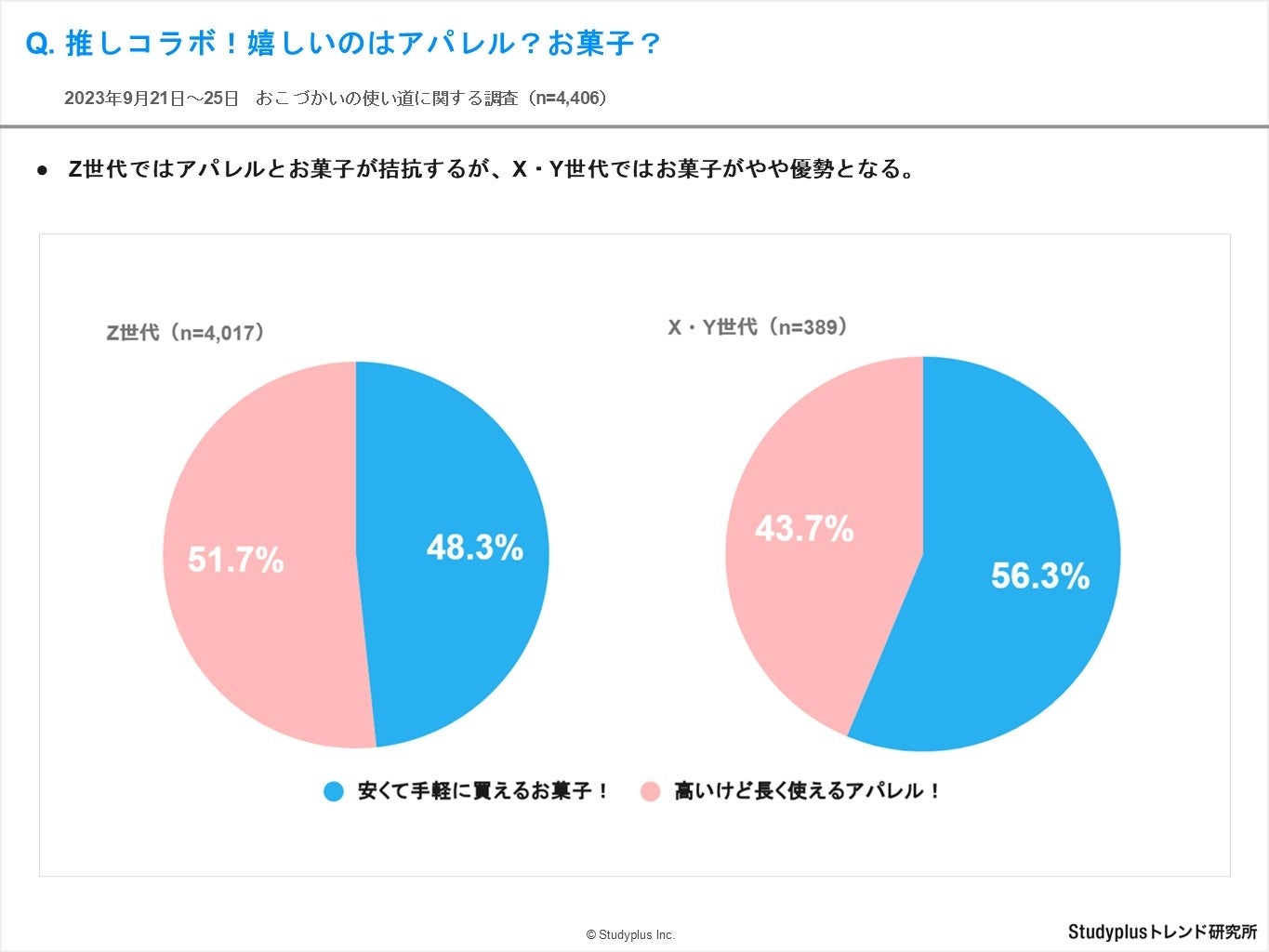 ・Z世代ではアパレルとお菓子が拮抗するが、X・Y世代ではお菓子がやや優勢となる。