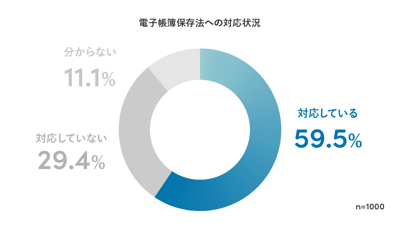 請求書関連業務に携わる1000名のビジネスパーソンのうち、電子帳簿保存法に「対応している」と答えたのは59.5%で「対応していない」が29.4%、「分からない」が11.1%という結果でした。今年2月に実施した当社調査(※2)における対応率(49.2%)よりも10%程度上昇したものの、宥恕期間終了が目前に迫る中で、いまだ対応が進んでいない現状が明らかになりました。