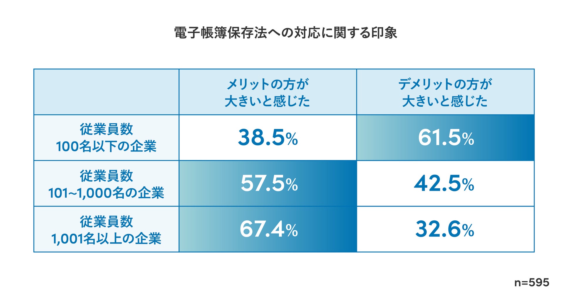 続いて、電子帳簿保存法に対応した企業に、対応による変化をたずねたところ、メリットを感じている人が50.6%と過半数をやや上回りました。特に対応のメリットを感じているのは従業員数が1001名以上の大企業で、メリットの方が大きいと回答した企業が67.4%にのぼり、全体の3分の2以上を占めました。