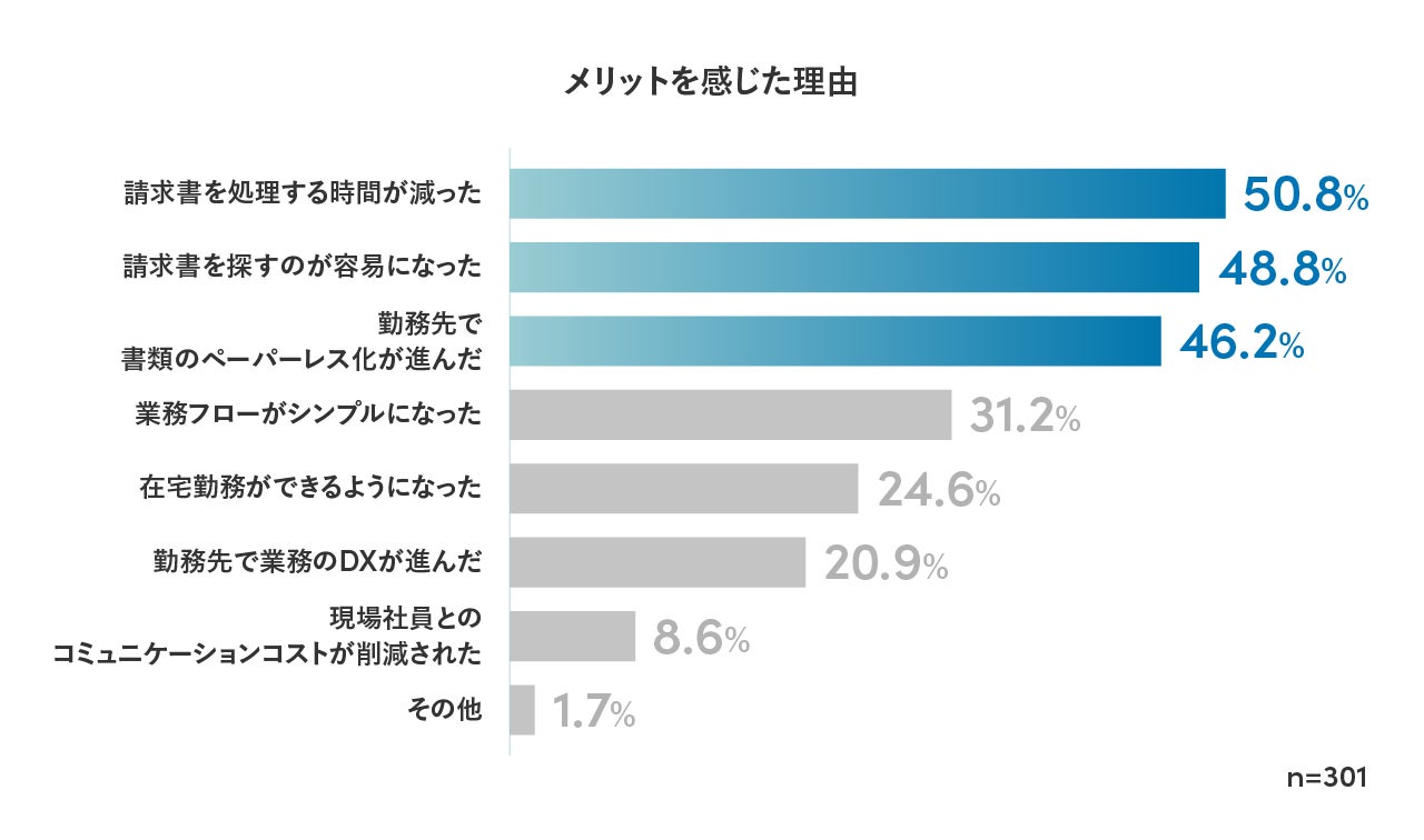 また、メリットの方が大きいと答えた企業に具体的な理由を聞いてみると、第一位は「請求書を処理する時間が減った」、第二位は「請求書を探すのが容易になった」、第三位は「勤務先で書類のペーパーレス化が進んだ」という結果でした。電子帳簿保存法への対応は、業務効率化の推進やペーパーレス化につながっていることが分かりました。